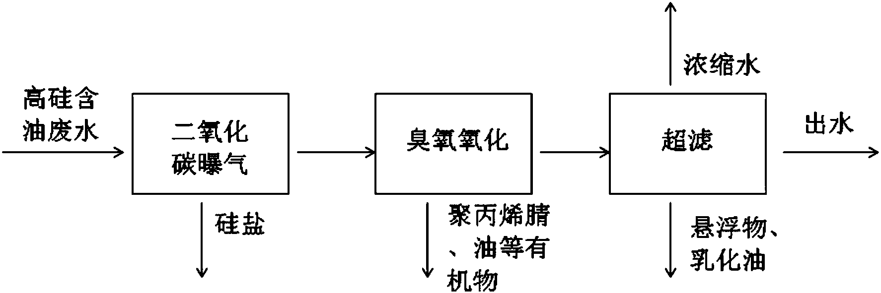 本發明采用臭氧在廢水中形成羥基自由基與聚丙烯酰胺和油等有機物發生氧化反應從而降解有機物,降低含油量和黏度。采用二氧化碳曝氣調節廢水pH至3-7,在酸性條件下高硅含油廢水中硅酸鈉與二氧化碳發生反應形成絮狀硅酸膠體降低廢水中硅鹽含量,其主要反應方程為Na2SiO3+CO2+H2O=H2SiO3+Na2CO3,膜分離采用陶瓷超濾技術,使得乳化油和固體懸浮物被有效截留。