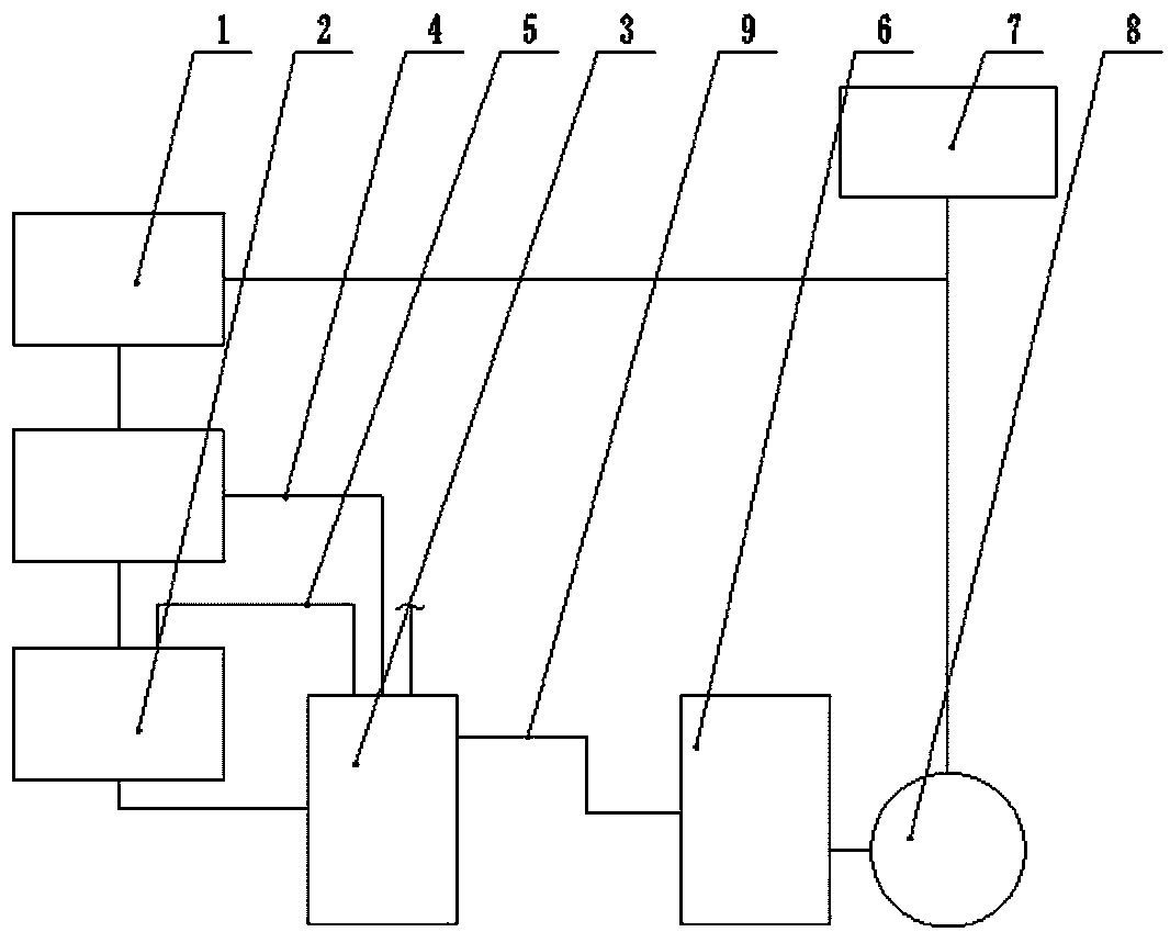 1.真空泵新型廢水回收系統,包括兩臺羅茨泵(1)、水環泵(2)和第一水箱(3),兩臺所述羅茨泵(1)串接在一起后,再與所述水環泵(2)連接,兩臺所述羅茨泵(1)和水環泵(2)均通過羅茨泵循環水管(4)和水環泵循環水管(5)與第一水箱(3)連通,形成兩個循環水路,作為各自對應的冷卻水路,其特征在于,還包括第二水箱(6)、冷卻水池(7)和水泵(8),所述第二水箱(6)的進水口通過溢流管(9)與第一水箱(3)連通,所述第二水箱(6)的出水口處連接有水泵(8),所述水泵(8)的進水口與第二水箱(6)連通,所述第二水箱(6)的出水口一分為二,其中一路通過管路與羅茨泵循環水管(4)連通,另一路通過管路與冷卻水池(7)連通。