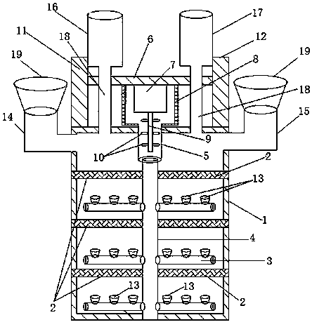進一步,所述的鼓風葉片安裝在鼓風驅動軸上,所述的罩斗安裝在左污水進筒和右污水進筒的頂部,所述的氣動嘴安裝在氣動攪拌管上。