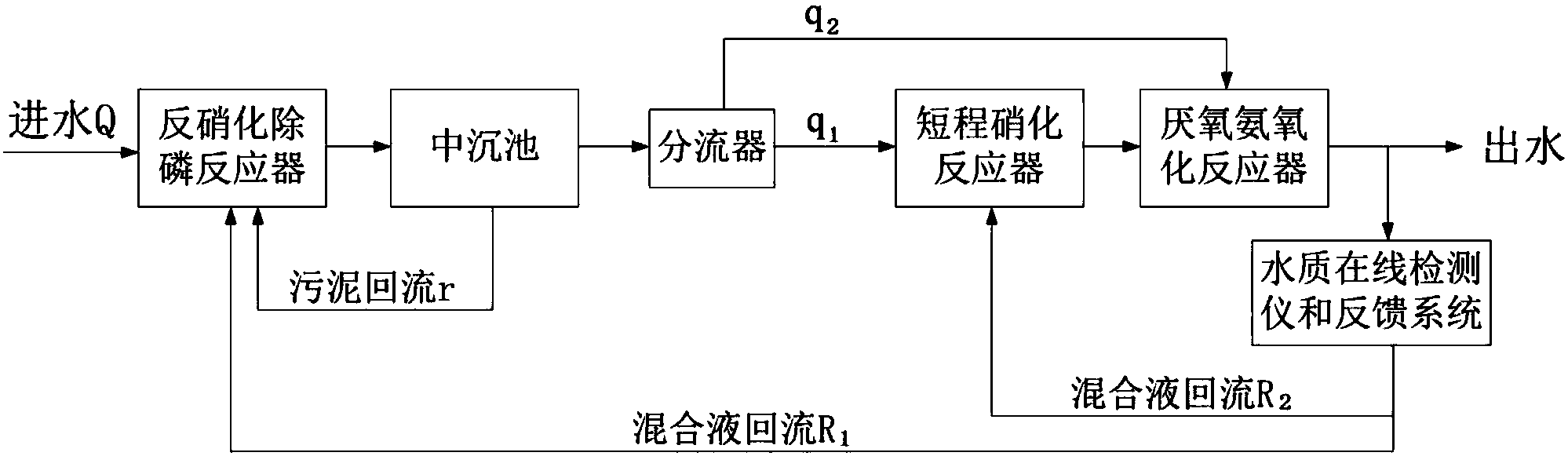 3)分流器:將中沉池的出水引入分流器,在分流器中將其分為兩部分,第一部分出水(污水量記為q1)進入短程硝化反應器,第二部分出水(污水量記為q2)進入厭氧氨氧化反應器,通過厭氧氨氧化反應器上的水質在線測定儀對厭氧氨氧化反應器出水中的氮素組成和含量進行實時監控,并將結果輸出給流量控制器,調節進入短程硝化反應器和厭氧氨氧化反應器的污水比例;當出水中NH4+-N含量較高時,降低進入厭氧氨氧化反應器的污水量;當出水中NO2--N含量較高時,提高進入厭氧氨氧化反應器的污水量;當出水中NO3--N含量較高時,提高厭氧氨氧化反應器回流至反硝化除磷反應器的污水量(污水量記為R1);