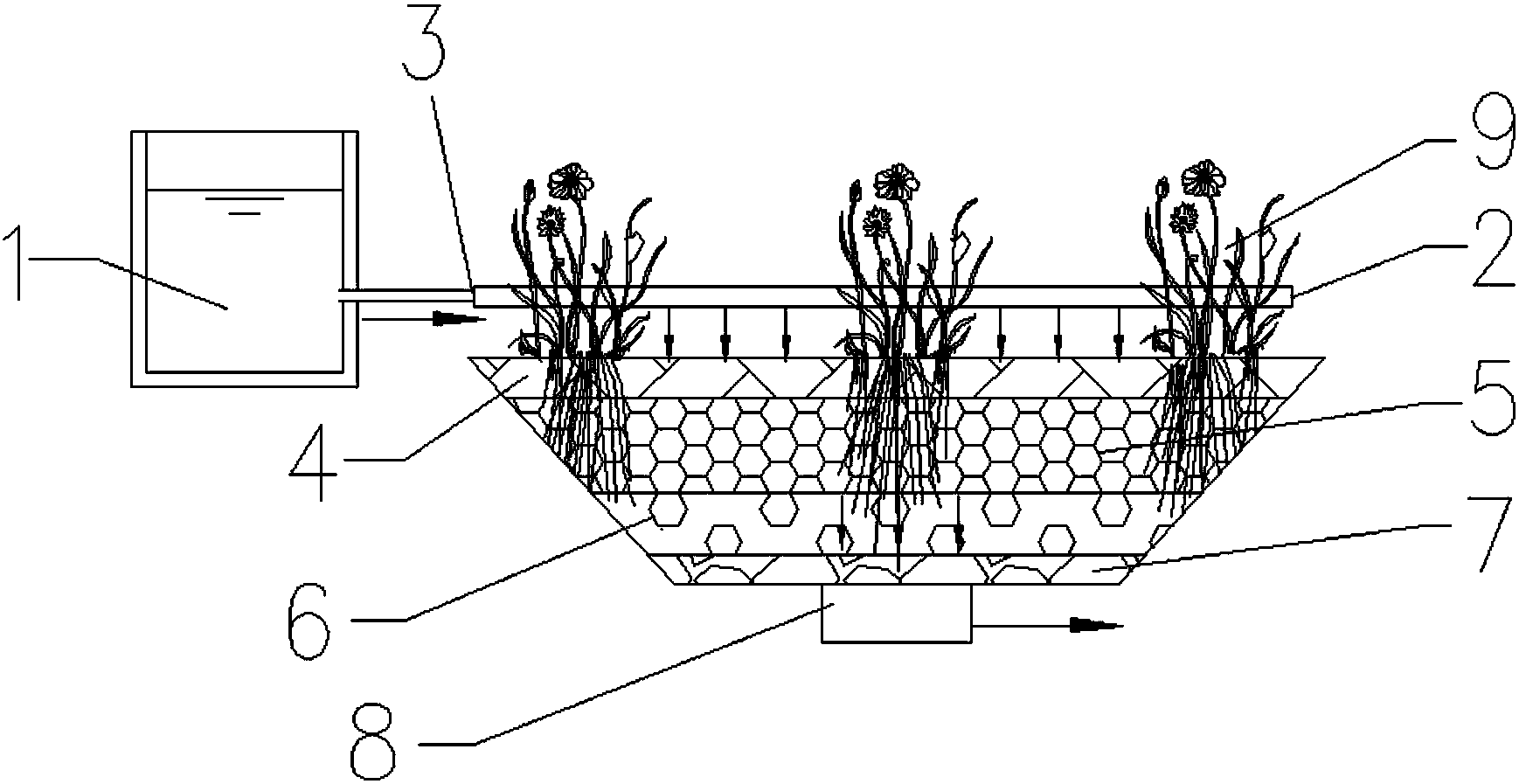 1.一種人工濕地系統(tǒng),其特征在于,該系統(tǒng)包括由上至下依次設(shè)置的: