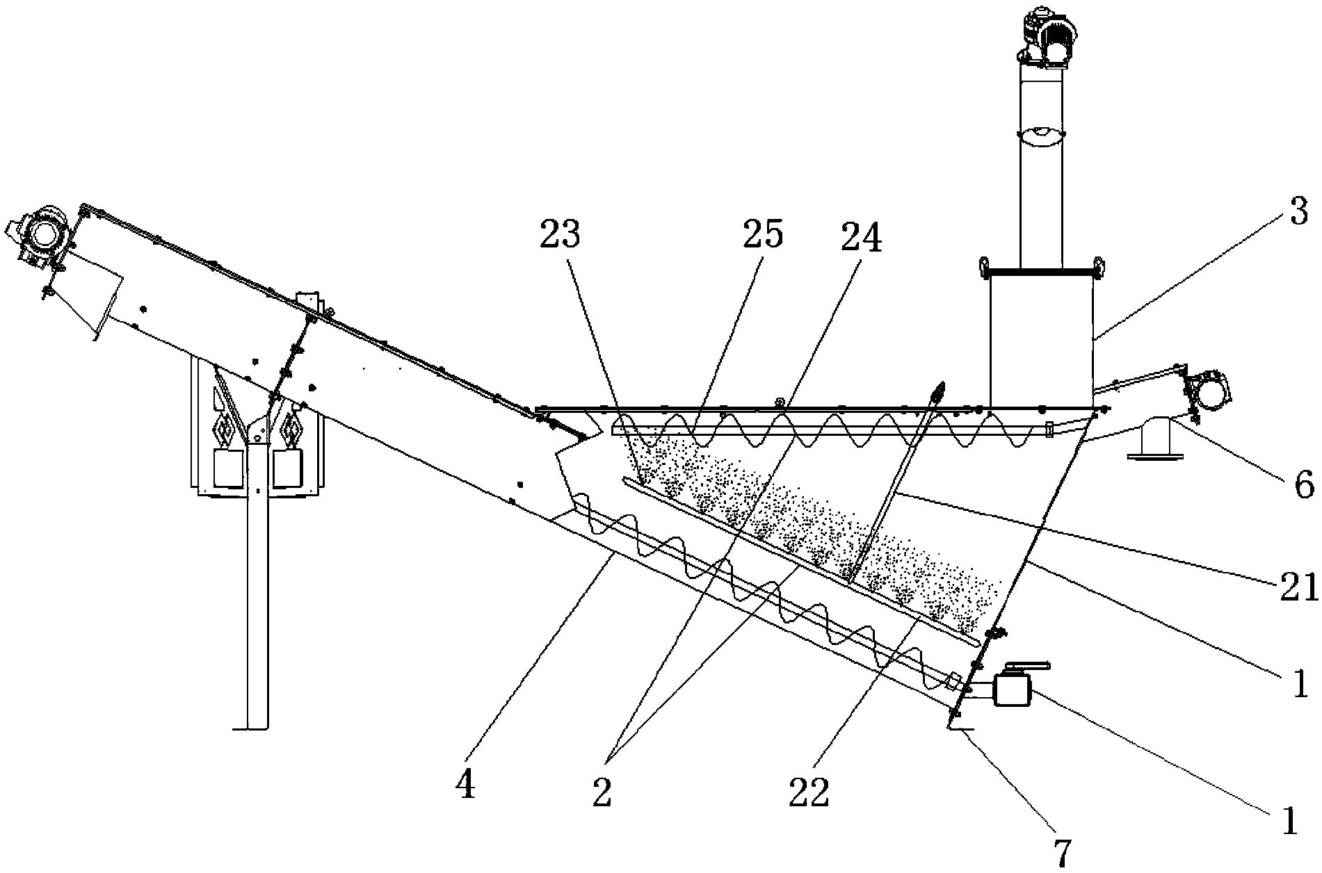 優(yōu)選地,所述錐形沉淀池的上部設(shè)有污水排出口,所述螺旋輸送器上設(shè)有排污口。