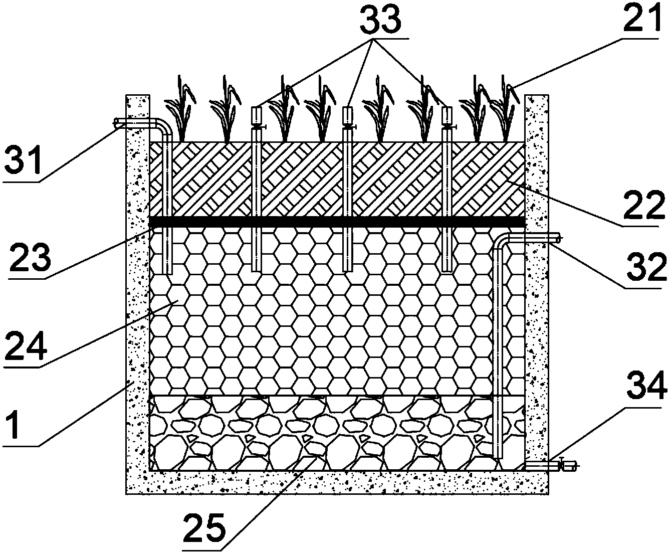 脫氮床床體,其由外墻體包圍并位于中空方體中,脫氮床床體從上到下依次分布為草皮層、土壤層、碳源層和礫石層;