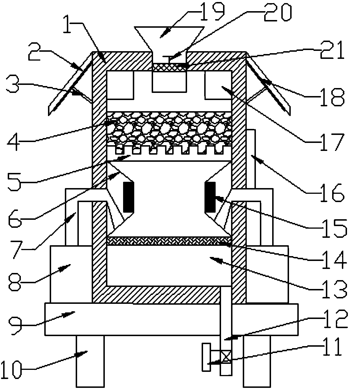 1.一種微生物污水凈化處理設(shè)備,包括箱體、太陽能光伏板、曝氣風(fēng)機(jī)、底座和支腳;其特征是,所述箱體上方設(shè)有進(jìn)水口;所述進(jìn)水口設(shè)置成漏斗狀;所述進(jìn)水口穿過箱體上方,進(jìn)水口內(nèi)設(shè)置有過濾板;所述過濾板與進(jìn)水口可拆卸連接,過濾板上固定有把手;所述箱體的外壁上方周圍鉸接有太陽能光伏板;所述太陽能光伏板的下方固定連接支撐擋板;所述支撐擋板上設(shè)有檔位槽,支撐擋板下方設(shè)置支撐柱,支撐柱卡在檔位槽上;所述支撐柱固定在箱體上;所述箱體內(nèi)部上方兩側(cè)設(shè)有蓄電池;所述進(jìn)水口下方設(shè)置有微生物凈化層;所述微生物凈化層內(nèi)設(shè)有微生物菌落;所述微生物凈化層下方設(shè)有橫拖板;所述橫拖板下方固定連接梯形斜導(dǎo)板;所述梯形斜導(dǎo)板對稱設(shè)置在箱體的左右兩側(cè);所述梯形斜導(dǎo)板內(nèi)部固定連接紫外線發(fā)生器;所述梯形斜導(dǎo)板的下方設(shè)置一塊活性炭吸附板;所述活性炭吸附板的下方設(shè)有蓄水箱;所述蓄水箱的左下角設(shè)有出水管;所述出水管穿過箱體和底座,出水管位于底座下方處設(shè)有控制閥門;所述箱體的右側(cè)外壁上固定連接控制裝置;所述箱體固定在底座上;所述底座下方均勻設(shè)置四根支腳;所述底座的左右上方設(shè)有曝氣風(fēng)機(jī);所述曝氣風(fēng)機(jī)上通入曝氣進(jìn)氣管;所述曝氣進(jìn)氣管穿過箱體與梯形斜導(dǎo)板的下方固定連接。