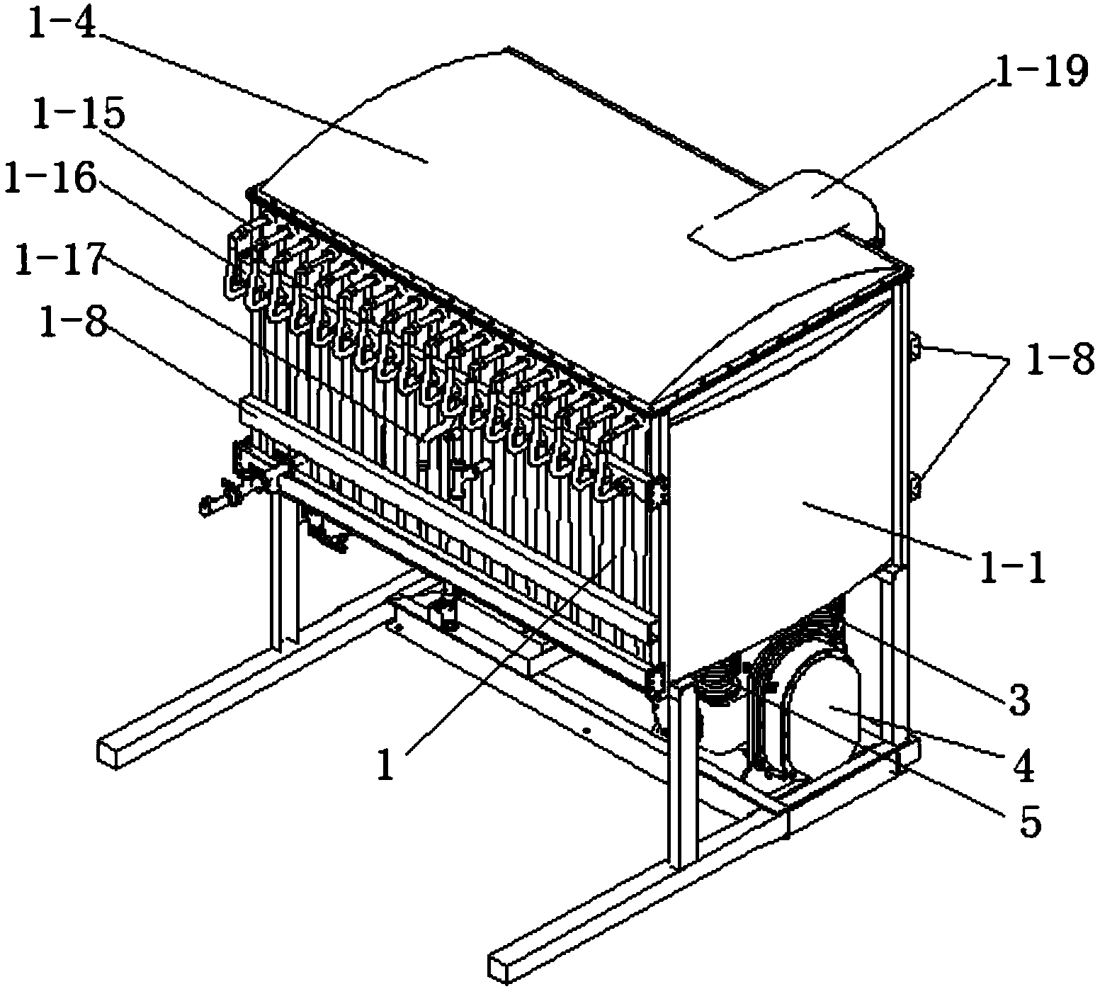 2.根據權利要求1所述的一種水處理用中小型蒸汽壓縮蒸餾裝置,其特征在于:所述蒸發器(1)包括長方體狀的蒸發器殼體(1-1),蒸發器殼體(1-1)的上方水平設置有蒸發室液滴濾除板(1-3),蒸發室液滴濾除板(1-3)的上方水平設有蒸發器頂蓋(1-4),蒸發器頂蓋(1-4)的側面還設有與羅茨風機(4)進氣口連接的蒸發室出氣口(1-7);蒸發器殼體(1-1)的底部水平設有蒸發器底蓋(1-9),蒸發器底蓋(1-9)上開設有冷凝室進氣口(1-10),蒸發器底蓋(1-9)的上方水平設有冷凝室布氣板(1-11)。