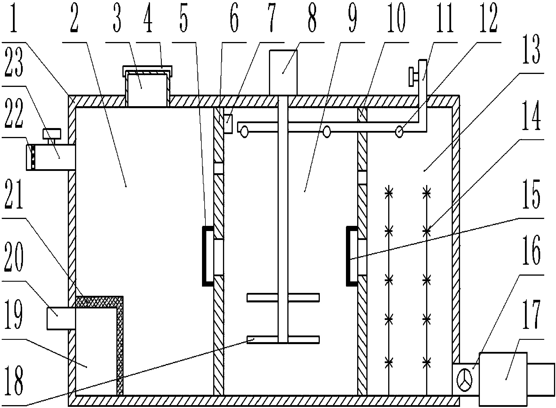 作為本發(fā)明進(jìn)一步的改進(jìn)方案:所述沉淀池與厭氧發(fā)酵池之間設(shè)有第一隔板,且厭氧發(fā)酵池與過(guò)濾池設(shè)有第二隔板。
