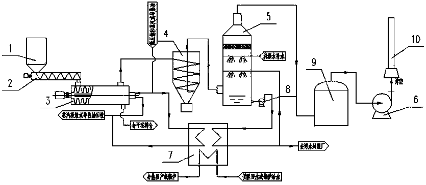 一種高效節能環保的污泥干化系統,包括污泥料倉1、螺旋給料機2、污泥干化機3以及尾氣處理系統;污泥料倉1與螺旋給料機2相連,螺旋給料機2與污泥干化機3相連;其特征是所述的尾氣處理系統包括旋風除塵器4、洗氣塔5、洗滌水泵8、吸附罐9、引風機6以及煙囪10;所述污泥干化機3的尾氣出口與旋風除塵器4相連,之后依次與洗氣塔5、活性炭吸附罐9、引風機6、煙囪10依次相連,所述洗滌水泵8的入口與洗氣塔5底部相連、出口與溴化鋰熱泵7相連;濕污泥由螺旋給料機2從污泥料倉1輸送至污泥干化機3,在污泥干化機3內被低溫蒸汽或者導熱油或熱煙氣或熱空氣加熱干化,干化過程中蒸發的水汽及不凝氣形成尾氣從污泥干化機3頂部離開污泥干化機3進入旋風除塵器4,經旋風除塵器4除塵,而后進入洗氣塔5進行洗滌降溫,所產生的廢氣再進入活性炭吸附罐9吸附凈化后由引風機6引出并從煙囪10排出,洗氣塔5排出的洗滌水進入溴化鋰熱泵7進行余熱回收;經溴化鋰熱泵7取走熱量降溫后的洗滌水一部分去洗氣塔5循環洗氣,一部分送污水廠處理。
