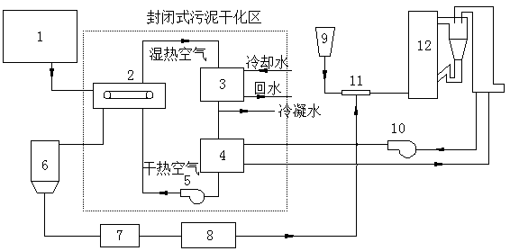 2)通過循環風機5將80- 90℃的干熱空氣送入皮帶式污泥干化裝置2,利用氣體流動和換熱對污泥進行干燥,產生含水率10~40%的干泥;