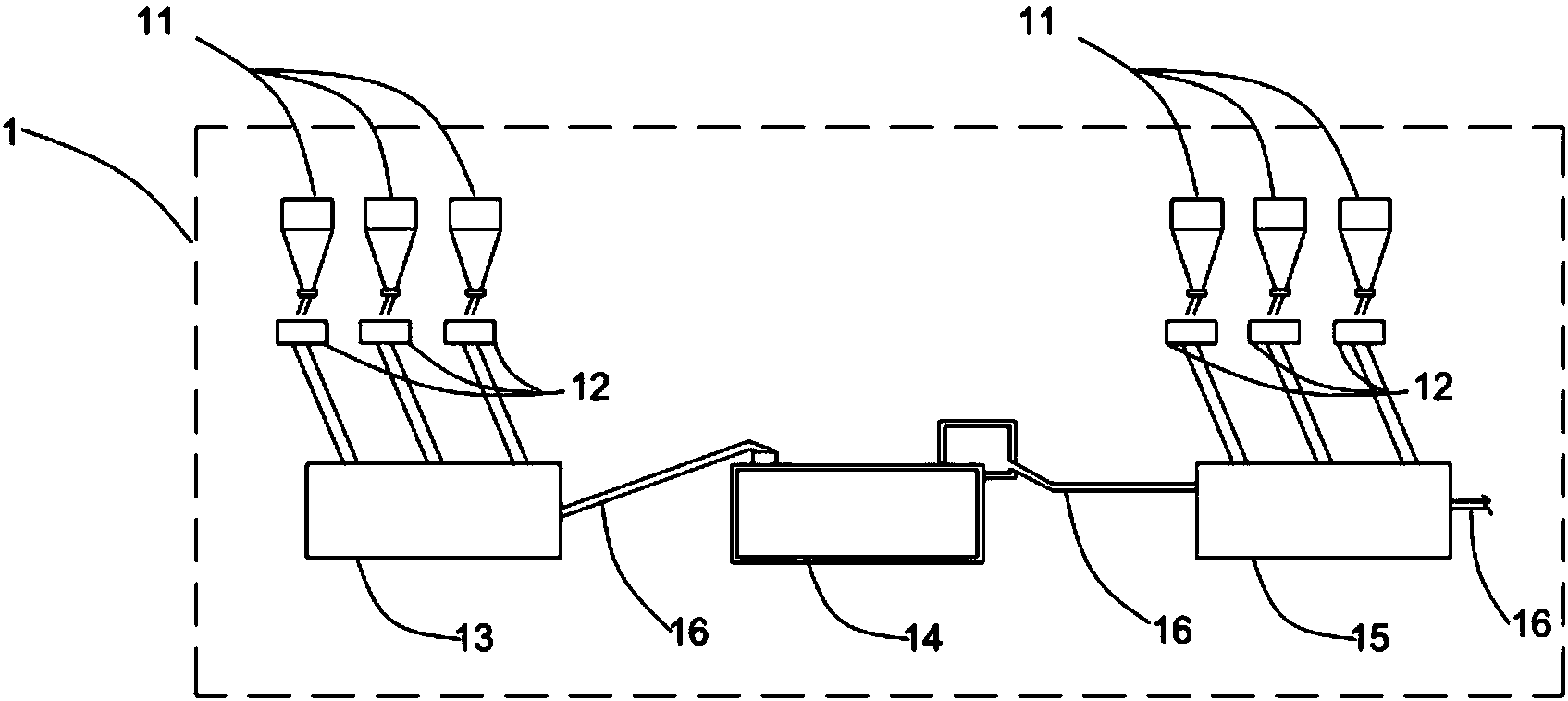 6.一種生活污泥的無害化處理系統,包括對生活污泥進行脫水預處理的預處理系統(1)、對混合污泥進行焚燒處理的負壓循環蓄熱焚燒系統(2)、殘渣處理系統(3)和對煙氣進行煙氣凈化處理的煙氣凈化系統(4),其特征在于,所述預處理系統(1)包括:用于混勻生活污泥、石灰和聚合氯化鋁的第一混料機(13),用于壓濾污泥的壓濾機(14)、用于混勻泥餅、生物質炭和糠殼的第二混料機,多個計量稱(12)和儲料倉(11),其中,第一混料機(13)、壓濾機(14)和第二混料機(15)依次通過運輸裝置(16)相連接,所述第一混料機(13)為雙軸螺旋混料機或犁刀混料機,所述第二混料機(15)為雙軸螺旋混料機或犁刀混料機,所述壓濾機(14)為鋼帶式壓濾機或板框壓濾機。