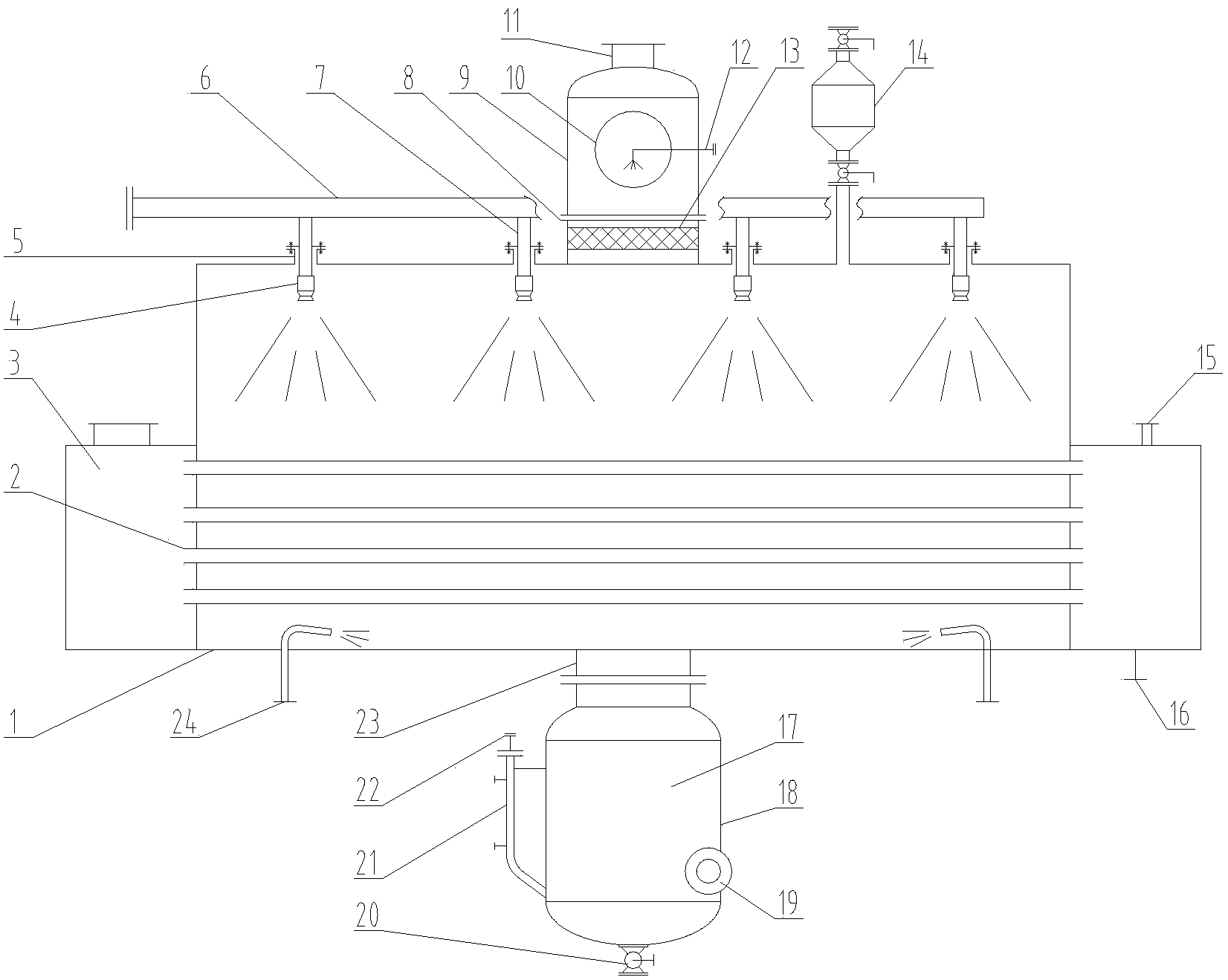 本發(fā)明的噴淋管路,噴淋主管與噴淋支管在蒸發(fā)室筒體外經(jīng)法蘭連接,而后,噴淋支管再與蒸發(fā)室相連,這樣設計可使在必要時每一個噴淋支管都可以單獨取出,檢修、維護或更換噴頭。