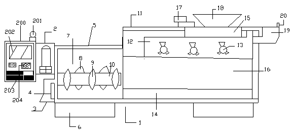 2.根據權利要求1所述的一種高效率疊螺污泥脫水機,其特征在于:所述電控柜(200)包括報警器(201)、顯示器(202)、CPU處理器(203)和操作鍵(204),所述報警器(201)設于顯示器(202)頂部,所述顯示器(202)底部連接操作鍵(204),所述操作鍵(204)連接CPU處理器(203),所述CPU處理器(203)連接動力組(2)、脫水主體(5)和濃縮部(11)、供水電磁閥(17)、污泥輸送泵(18)和藥泵(19)。