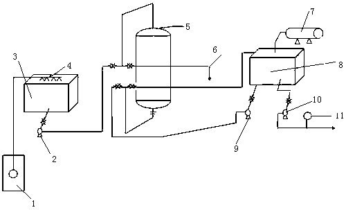 1.一種全自動變頻控制水處理供水設備,由深井泵(1)、提升泵(2)、曝氣水箱(3)、噴淋器(4)、過濾罐(5)、排污罐(6)、紫外線消毒器(7)、凈水箱(8)、反洗泵(9)、送水泵(10)及遠傳壓力表(11)組成,其特征是:地下水通過深井泵(1)提取送往曝氣水箱(3)經過濾罐(5)過濾送往凈水箱(8)經送水泵(10)送往紫外線消毒器(7)經反洗泵(9)、遠傳壓力表(11)送經用戶,所述反洗泵(9)可通過PLC可編程控制器反洗,每次反洗7分鐘,所述曝氣水箱(3)通過PLC、PID控制水位,并控制深井泵(1)、提升泵(2)、送水泵(10)及反洗泵(9)的自動啟動和停止,并顯示供水的設定壓力和實際壓力。