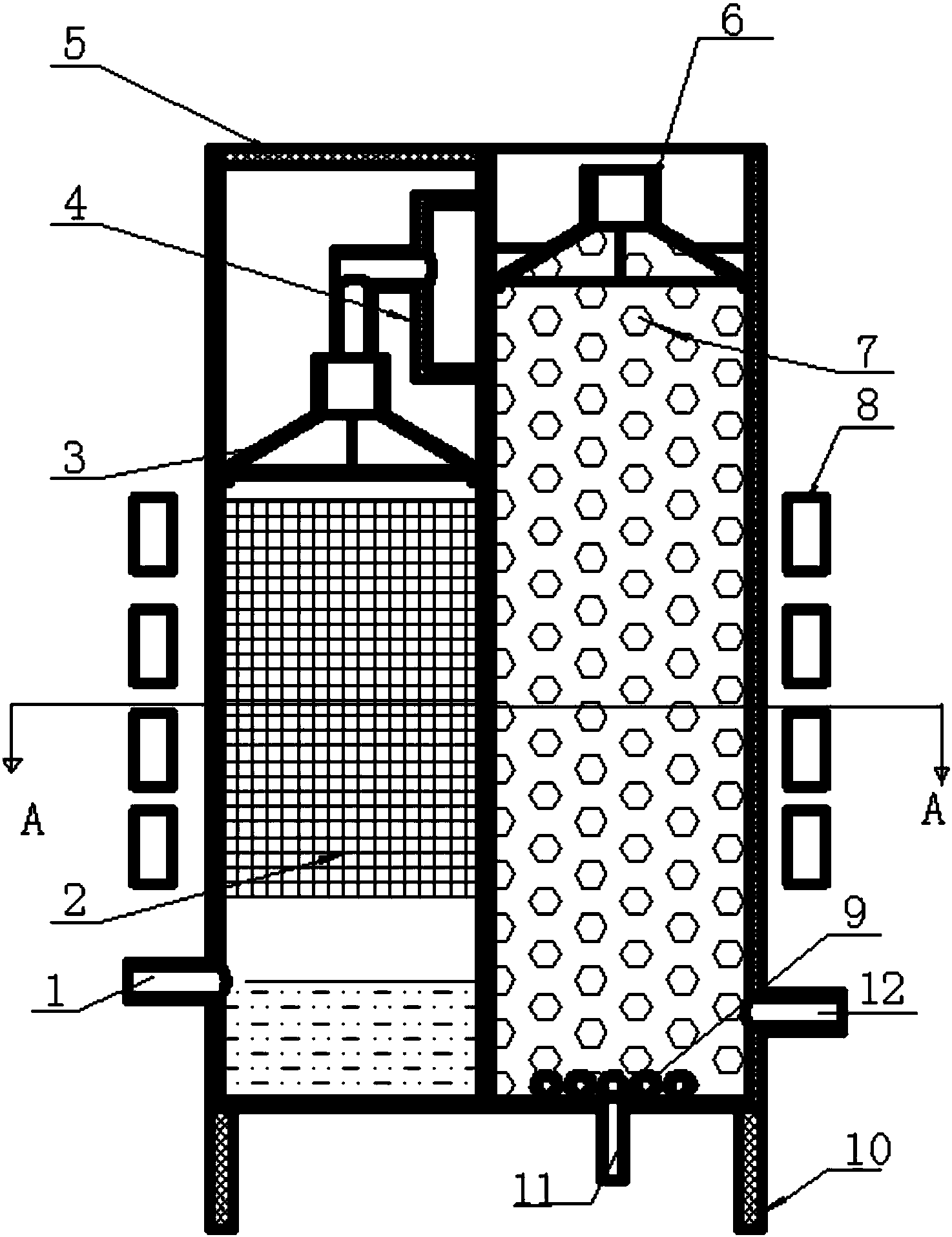 為彌補現(xiàn)有技術的不足,本發(fā)明提供一種污水生物除氮反應器,在充分利用了流化床傳質效率高,滴流床重復利用生物質優(yōu)點的同時,滿足了兩種反應對氧濃度的不同需求,還減少了生物菌體流失并降低了設備能量投入。