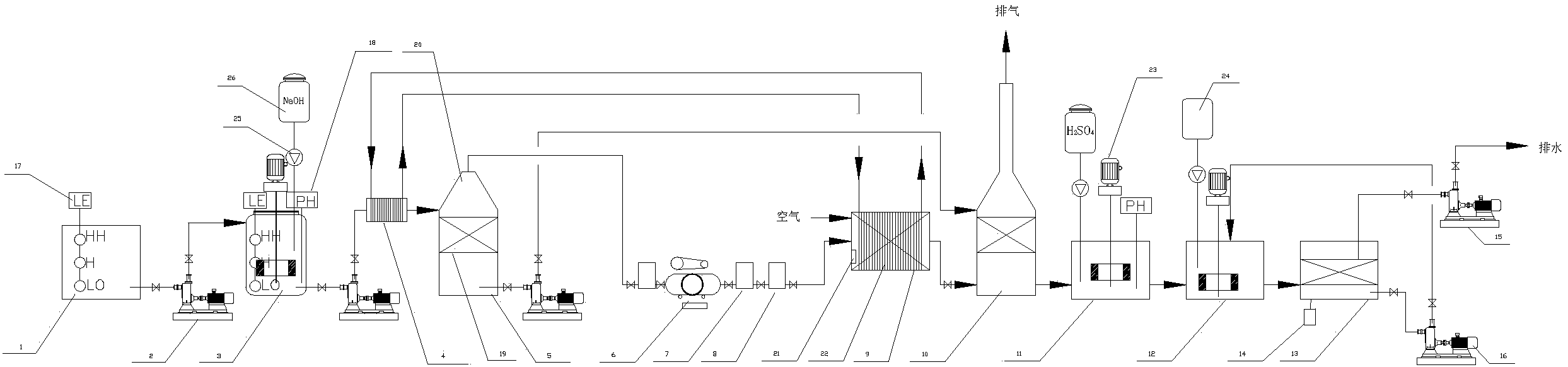 集水池內設置有液位計;pH調節槽設置有pH計;噴淋塔內部設有多孔支承板,多孔支承板上方堆積填料;預熱器與催化氧化反應器內的溫度控制器聯動;催化氧化反應器內設置催化金屬絲網;吸收塔內設置多孔支承板和填料;pH回調池內設pH計和攪拌機;缺氧池內設有攪拌機,并有碳源補充裝置;MBR池內設有供氣系統與膜過濾系統,由供氣系統提供氣源進行曝氣。