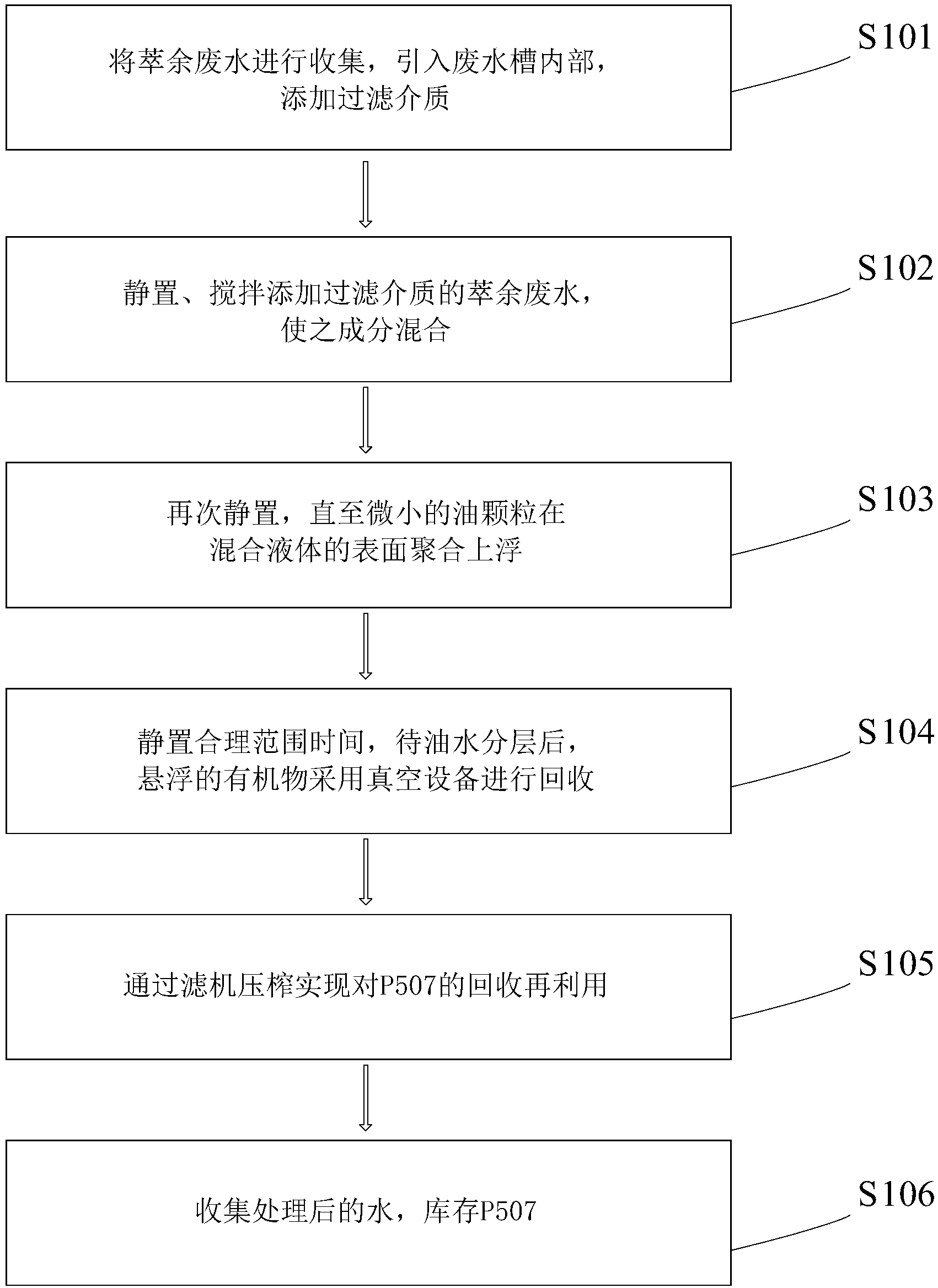 為了解決上述技術問題,本發明提供一種從萃余廢水回收P507的方法,以解決現有的萃余廢水回收P507方法存在著萃取劑消耗大,后續廢水處理成本較高和廢水排放不達標的問題,一種從萃余廢水回收P507的方法具體包括以下步驟: