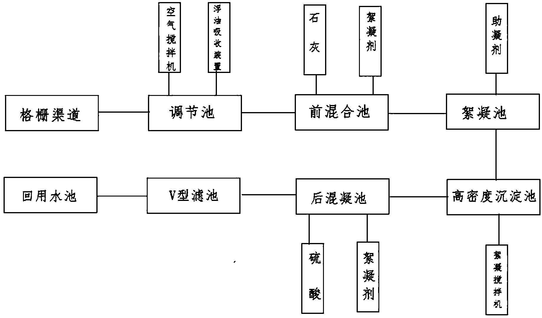 為解決以上技術(shù)問題,本發(fā)明的技術(shù)方案為:一種鋼渣冷卻廢水回收處理系統(tǒng),包括依次連接的用于過濾的格柵渠道、用于投放生石灰和絮凝劑的前混合池、用于絮凝的絮凝池、用于高密度沉淀的沉淀池、用于投放硫酸和絮凝劑的后混合池、用于過濾的濾池以及用于儲(chǔ)水的回用水池。