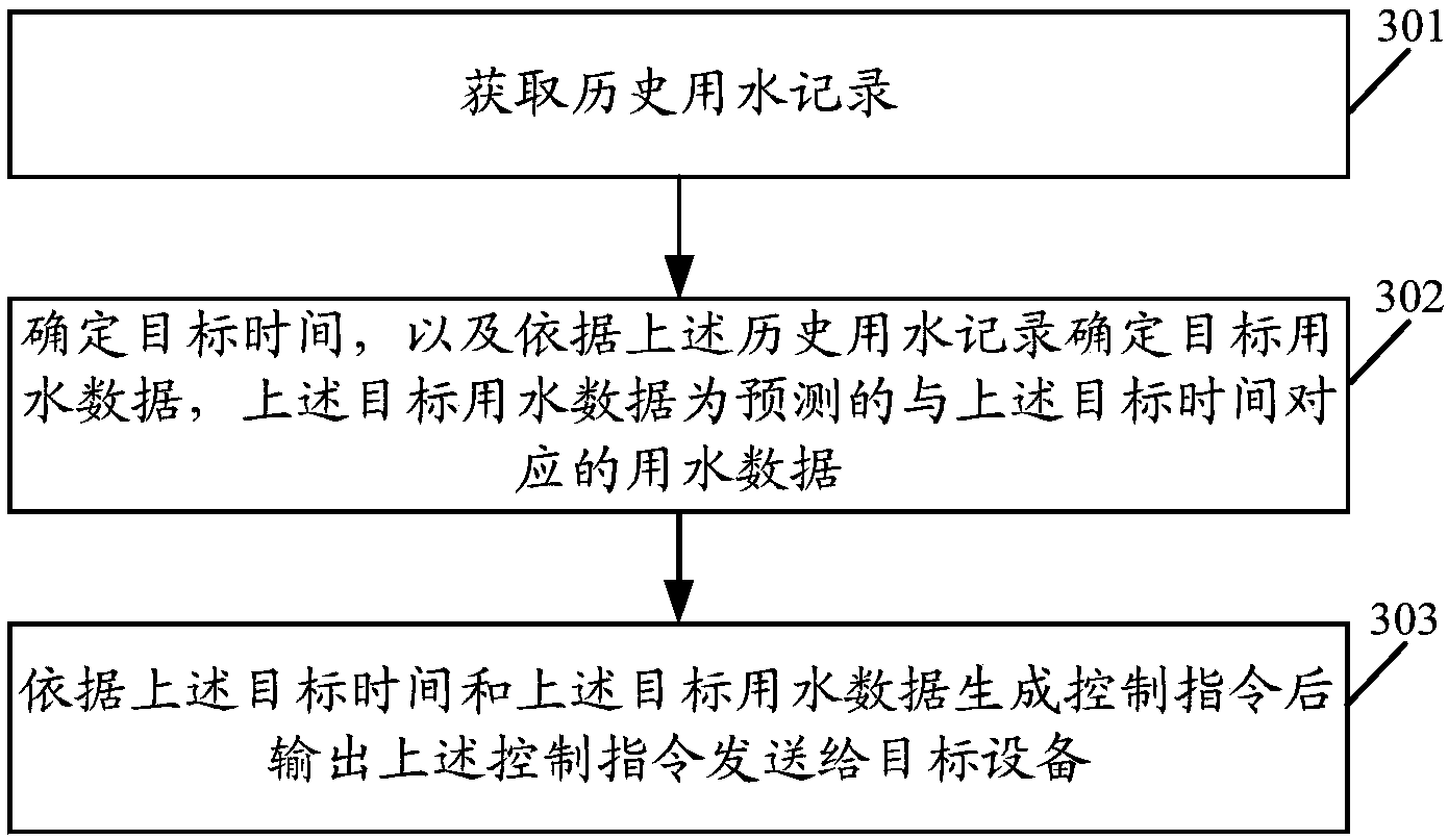 實施本發明實施例,服務器通過歷史用戶記錄來確定目標時間以及目標用水數據,從而預測出用戶的用水時間以及用水數據;在生成控制指令后,輸出該控制指令,通過該控制指令來控制相應的設備對水進行處理,進而方便用戶用水,且更加智能地適應用戶的生活規律,提高用戶的用水效率。