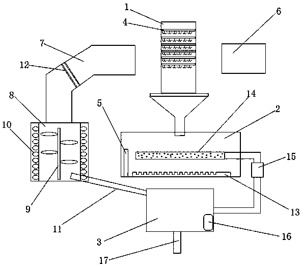 6.根據(jù)權利要求1所述的一種紡織污水處理凈化系統(tǒng),其特征在于:所述反應池(3)內(nèi)具有酸堿度監(jiān)測器(16),反應池(3)上還設置有排水管(17)。