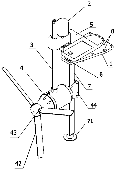 3.根據權利要求2所述的用于污水污泥處理的攪拌裝置,其特征在于,所述固定安裝板(1)上穿設有一根伸入污水/污泥液面內并固定的導軌(7),所述導軌(7)的上端穿過固定安裝板(1)后與驅動安裝座(5)連接、以用于隨驅動安裝座(5)一起轉動,所述攪拌器裝置(4)的一側通過升降固定件(44)可調節地固定于導軌(7)上、用于沿導軌(7)升降以調節攪拌器裝置(4)的攪拌深度。