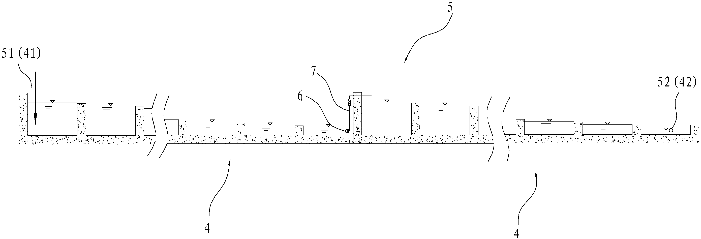 本發明解決第三個技術問題所采用的技術方案為:一種應用有上述入河污水凈化處理單元的入河污水原位凈化處理系統,其特征在于,包括進水總口和出水總口,由至少兩個上述入河污水原位凈化處理單元組成;相鄰的入河污水凈化處理單元中,其中一個入河污水凈化處理單元的出水支口與另一入河污水凈化處理單元的進水支口流體連通;位于兩端的入河污水凈化處理單元中,其中一個入河污水凈化處理單元的進水支口即為上述進水總口,而另一個入河污水凈化處理單元的出水支口即為上述出水總口;各入河污水凈化處理單元中的水沿進水總口向出水總口方向流動。