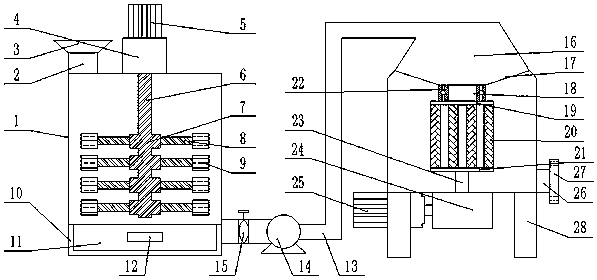 進一步,所述攪拌電機與所述攪拌軸固定連接,所述攪拌軸與所述固定塊固定連接,所述固定塊與所述連桿固定連接,所述連接桿與所述攪拌塊固定連接,所述連接桿以攪拌軸為中心圓周分布。此結構可以更加充分的攪拌廢水,以過濾廢水中的大顆粒物質,從而完成初步處理。