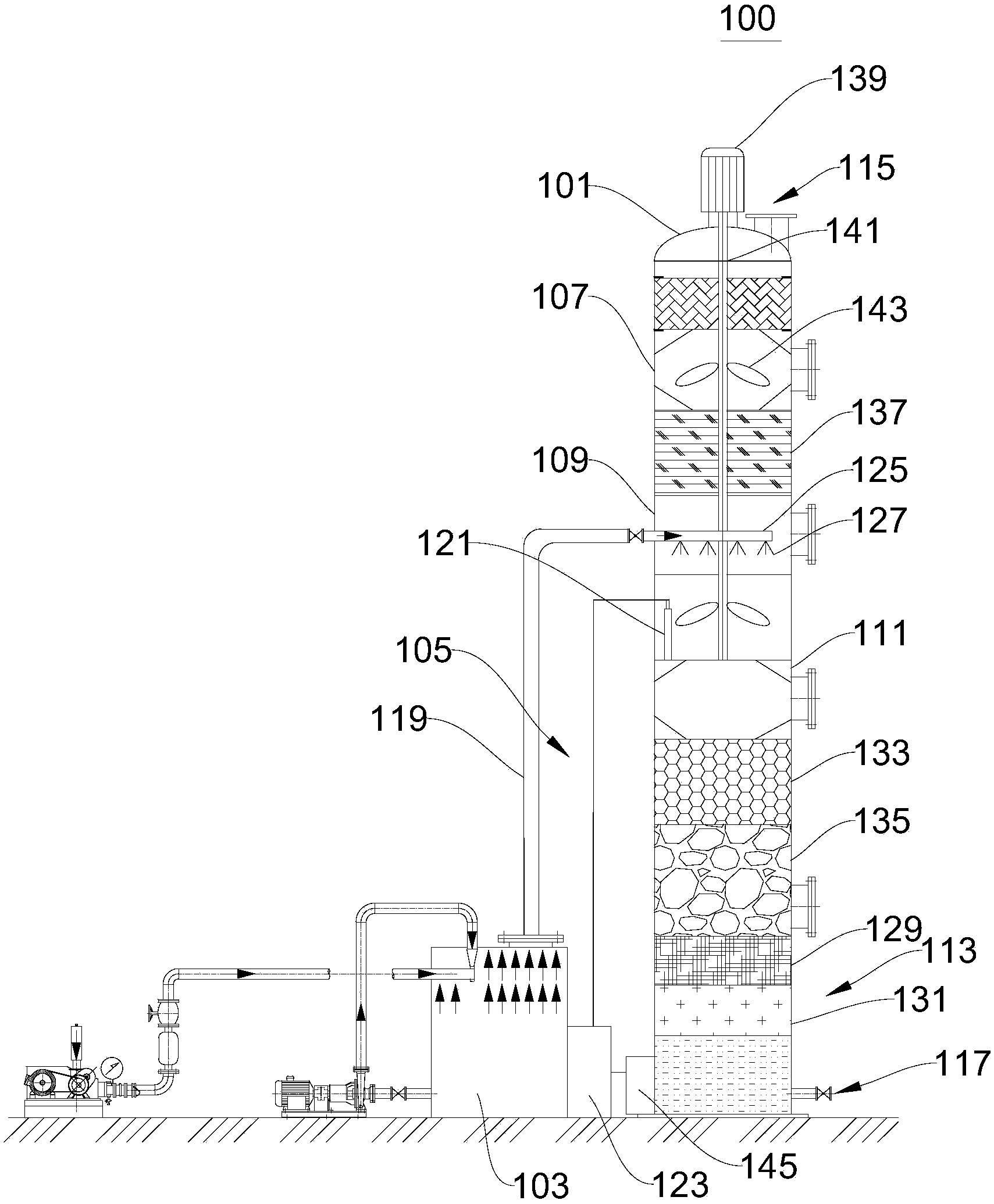 首先,裝置本體具有從上到下依次設(shè)置的各種凈化段,將污水通入一個(gè)設(shè)備即可進(jìn)行各方面的污水處理,大大減小了工作人員的工作量,節(jié)約了工作成本與時(shí)間。