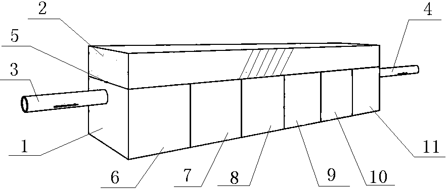 上述的一種農村家庭生活污水凈化系統,其中:地面下部分的方形槽,從污水進水方向開始,向方形槽中依次填入粘性不同的土壤(每個槽中的土壤要均勻混合),按重量計分別為第一箱:沙土50%、黏土50%;第二箱沙土40%、黏土60%;第三箱:沙土30%、黏土70%;第四箱:沙土20%、黏土80%;第五箱:沙土10%、黏土90%;第六箱:黏土100%。