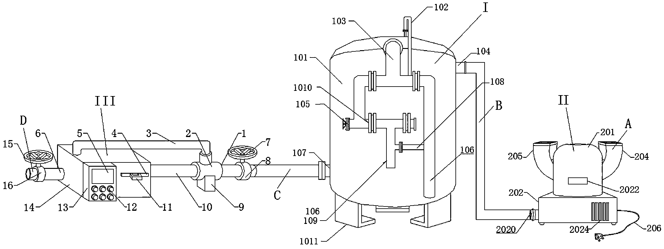 所述多介質過濾器(I)包括塔罐(101);塔罐(101)的一側設有裝濾管(103),裝濾管(103)的側面設有排氣管(102),裝濾管(103)的一端嵌入設置于塔罐(101)內,并與塔罐(101)連通,回流管(108)設置于裝濾管(103)的底部,排放口(107)設置于塔罐(101)的底部,進水管(104)設置于排放口(107)的頂部,并貫穿設置于塔罐(101)內,進水管(104)的底部設有若干呈“一”字排列的下滲口(1012),下滲口(1012)與進水管(104)連通;塔罐(101)的內部設有無煙煤過濾層(1013),無煙煤過濾層(1013)的底部設有粗砂過濾層(1014),粗砂過濾層(1014)的底部分別設有細沙過濾層(1015)和砂礫支撐層(1016),砂礫支撐層(1016)的內部設有若干均勻分布的滲漏器(1017),且砂礫支撐層(1016)覆蓋設置于滲漏器(1017)上,塔罐(101)的底部焊接設有若干對稱排列的支腳(1011);