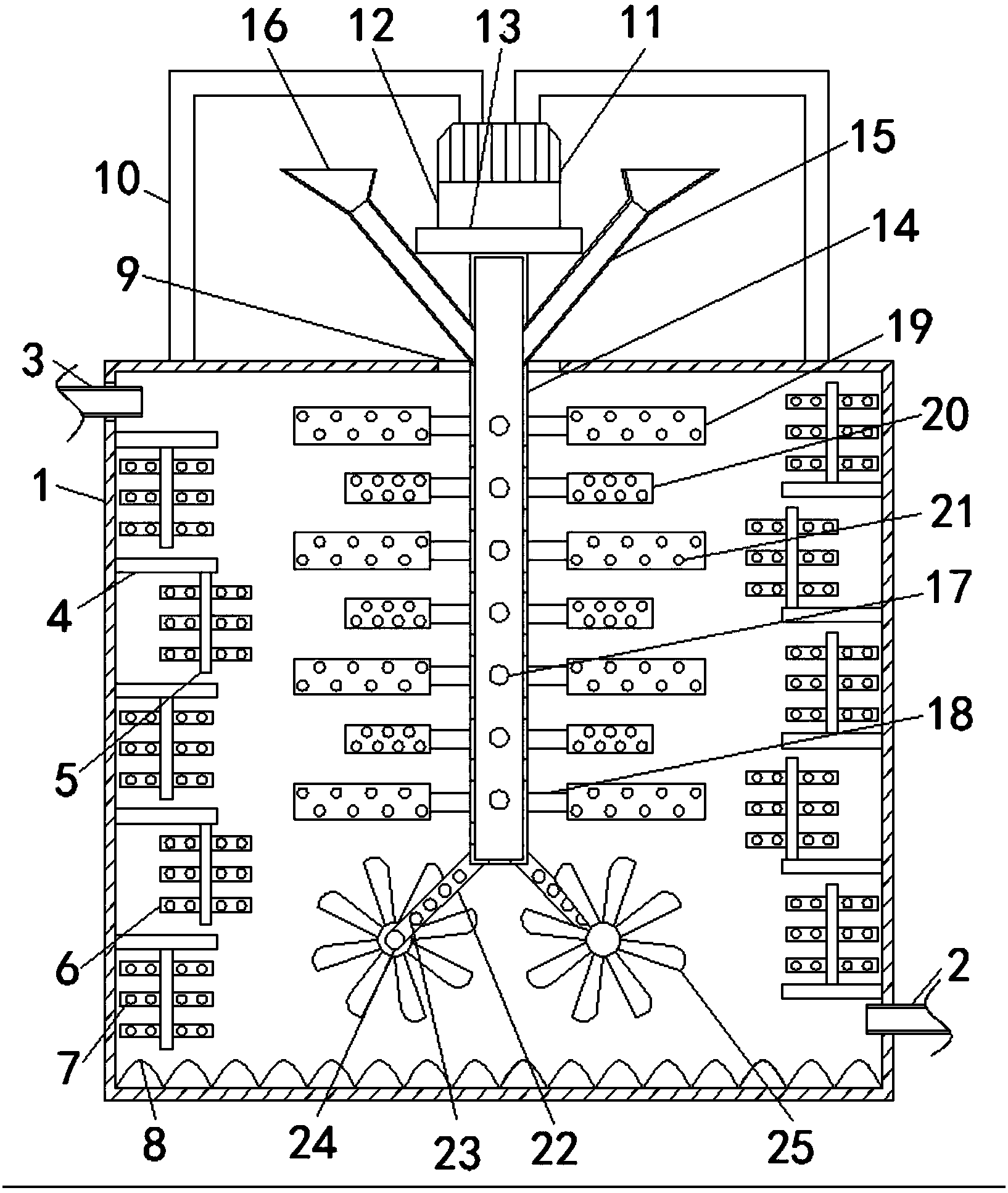 1.一種充分攪拌的污水攪拌室,包括攪拌箱(1),其特征在于:所述攪拌箱(1)右側的底部設置有進水管(2),所述攪拌箱(1)左側的頂部設置有出水管(3),所述攪拌箱(1)的內壁上固定連接有等距離排列的支撐橫桿(4),所述支撐橫桿(4)上固定連接有支撐豎桿(5),所述支撐豎桿(5)的左右兩側均固定連接有等距離排列的導流攪拌桿(6),所述導流攪拌桿(6)上開設有分水孔(7),所述攪拌箱(1)的內底壁固定安裝有均勻分布的阻流沉沙柱(8),所述攪拌箱(1)的頂部開設有通孔(9),所述攪拌箱(1)的頂部的兩側均固定連接有固定支架(10),所述固定支架(10)遠離攪拌箱(1)的一端固定連接有攪拌電機(11),所述攪拌電機(11)的底部固定安裝有減速機(12),所述減速機(12)的底部固定安裝有機架(13),所述機架(13)的底部轉動連接有轉軸(14),所述轉軸(14)頂部的兩側均固定連接有導管(15),所述導管(15)的頂端固定連接有漏斗(16),所述轉軸(14)上開設有均勻分布的混流孔(17),所述轉軸(14)的左右兩側均固定連接有等距離排列的連接桿(18),所述連接桿(18)遠離轉軸(14)的一端交錯固定連接有攪拌長槳(19)和攪拌短槳(20),所述攪拌長槳(19)和攪拌短槳(20)上開設有等距離分布的攪拌孔(21),所述轉軸(14)底端的兩側均固定連接有旋槳桿(22),所述旋槳桿(22)上開設有等距離排列的旋槳桿孔(23),所述旋槳桿(22)遠離轉軸(14)的一端固定連接有槳軸(24),所述槳軸(24)轉動連接有旋轉漿葉(25)。