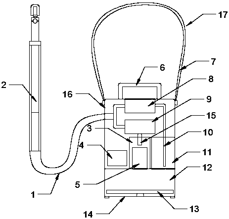 3.根據權利要求1所述的一種環保型工業廢水移動式取樣裝置,其特征在于:所述殼體(16)頂部的中間位置固定設置有提手(6),所述殼體(16)頂部的兩側固定安裝有肩帶(7)。