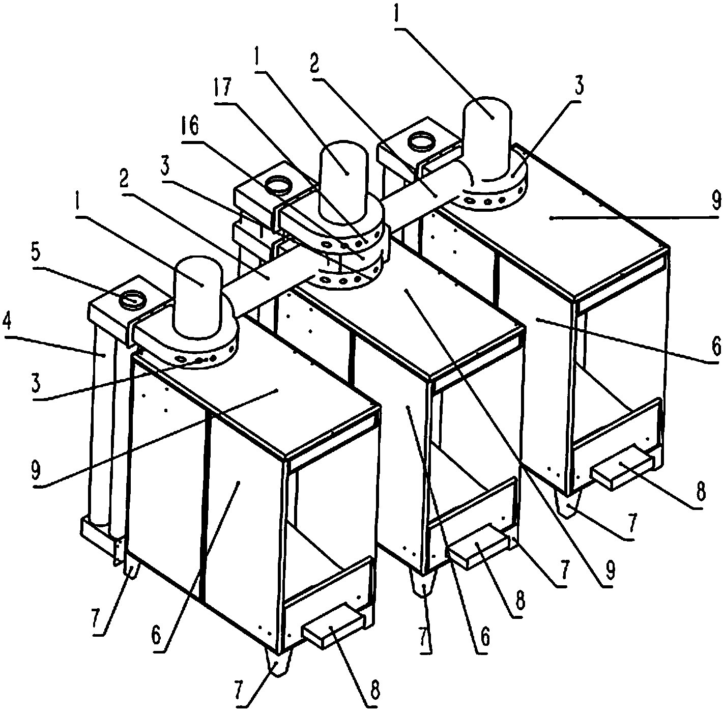 1.一種三工位自帶油煙污水處理的燒烤架,其特征在于:包括抽油煙機、油煙管、吸氣罩、焦油收集罐、焦油收集罐固定塊、燒烤架架體、支撐腳、出沉渣區、燒烤工作臺面、出浮渣口、出水口、沉渣區、水區、廢水進口14、斜板、低溫等離子凈化器、排氣口;三工位自帶油煙污水處理的燒烤架是以燒烤架架體作為基體,在燒烤架架體底面的四個角分別安裝一個支撐腳,支撐腳與地面接觸;在燒烤架架體的上面設置一燒烤工作臺面,在燒烤架架體的上表面偏后位置設置了吸氣罩,在吸氣罩的的外表面分布若干個吸氣孔;三工位自帶油煙污水處理的燒烤架設置了三個工位,左右和中間分別設置一臺燒烤架,左右的吸氣罩的出氣口都通過油煙管匯到中間位置進入低溫等離子凈化裝器,中間一臺燒烤架的吸氣罩抽吸的油煙直接進入低溫等離子凈化裝器,在油煙管的進口處都設置一臺抽油煙機,低溫等離子凈化裝器的出氣口對接著排氣口,低溫等離子凈化裝器的出油口接著焦油收集罐入口,焦油收集罐通過焦油收集罐固定塊固定在燒烤架架體上,在燒烤工作臺面的上方設置廢水進口;廢水進口另一端與燒烤架架體內部連接,燒烤架架體內部的左上角安置出浮渣口,出浮渣口下方是水區,水區下方是沉渣區,沉渣區與水區通過斜板分開,斜板與燒烤架架體內表面的接觸采用防漏處理,斜板的斜下處設置出浮渣口,燒烤架架體內的右上方設置了出水口,出水口低于出浮渣口,出沉渣區設置在沉渣區的上方,并與外界相通。