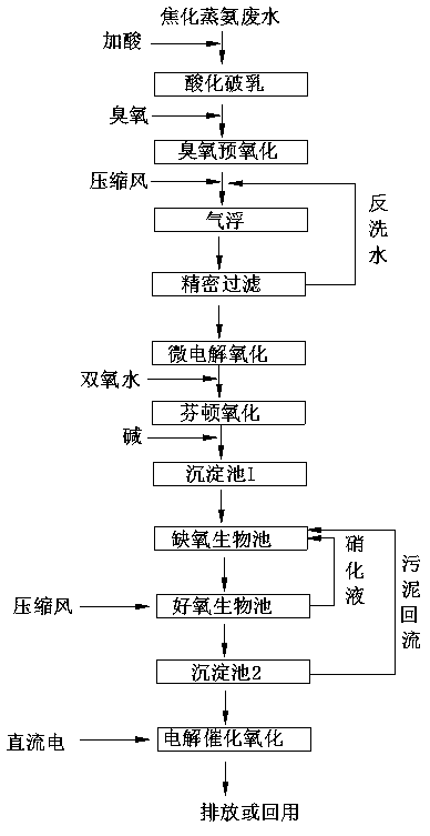 一種焦化蒸氨廢水深度處理方法,包括以下處理步驟:a.將乳化態的煤焦油破乳、形成懸濁液的酸化破乳步驟,酸化液PH值控制在1.5‑3.5,破乳時間為1‑3小時;b.促進煤焦油析出并氧化溶于水的酚類和氰類物質的臭氧預氧化步驟;c.將破乳后的煤焦油和水分離的氣浮步驟;d.二次脫酚除油的精密過濾步驟;e.去除部分有機物的同時對有機物開環斷鏈的微電解步驟,進水控制進水PH值為2‑3,出水控制PH值為3‑4,微電解時間為15‑120分鐘;f.芬頓氧化步驟;g.去除的缺氧/好氧生化步驟;h.對有機物和氨氮進行深度處理的電解催化氧化步驟。處理效果可達到《污水綜合排放標準》GB8978‑1996中對COD、氨氮、總氮指標的排放濃度限值要求。