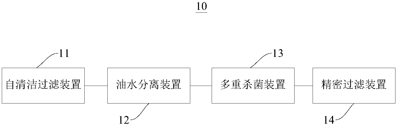 所述油水分離裝置、所述自清潔過濾裝置、所述油水分離裝置、所述多重殺菌裝置和精密過濾裝置依次連接。