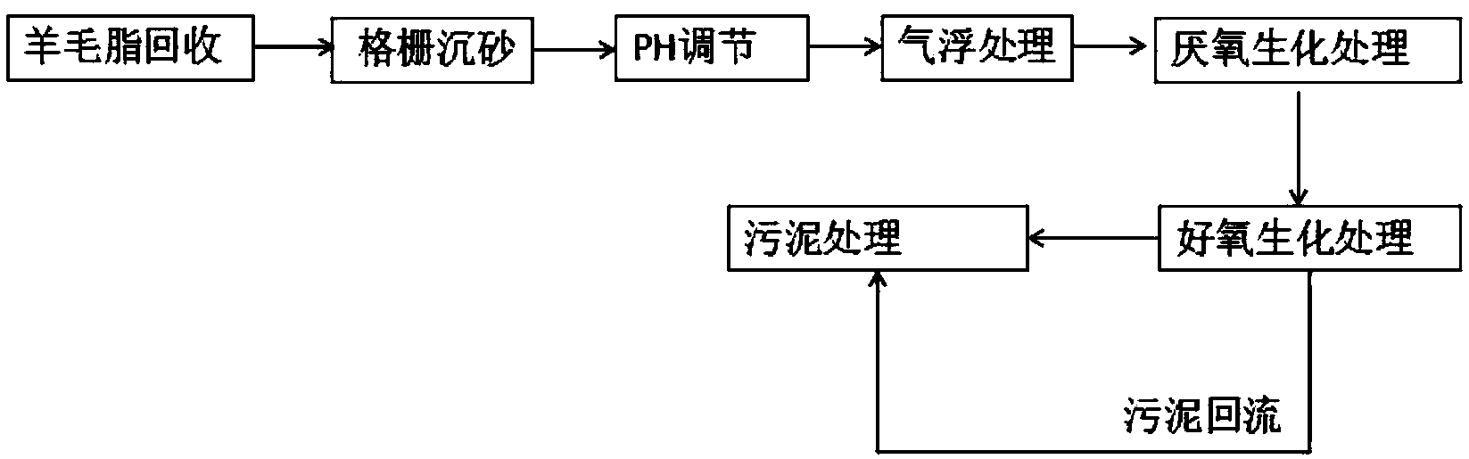 本發明公開一種洗毛廢水處理方法,包括以下步驟:羊毛脂回收處理;PH調節處理,氣浮處理,厭氧生化處理,好氧生化處理,水解酸化池,出水進入三級A/O池;污泥處理;一級氣浮池、二級氣浮池、水解酸化池、A/O池內的污泥排至污泥濃縮池進行濃縮,污泥濃縮池的上清液回流至調節池,濃縮后污泥進行脫水,泥餅外運處置。本發明所提供的方法能夠有效去除洗毛廢水中高濃度有機質。