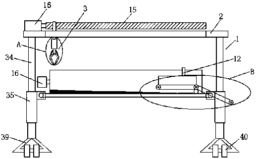 進(jìn)一步,所述支撐板通過其兩側(cè)的滑動(dòng)機(jī)構(gòu)設(shè)置在兩主桿之間,所述滑動(dòng)機(jī)構(gòu)包括滑動(dòng)槽和設(shè)置在其內(nèi)部前端的電動(dòng)推桿、后端的滑塊,所述滑動(dòng)槽的后端外側(cè)固定在主桿內(nèi)側(cè),所述滑塊固定連接在支撐板的側(cè)邊后端。