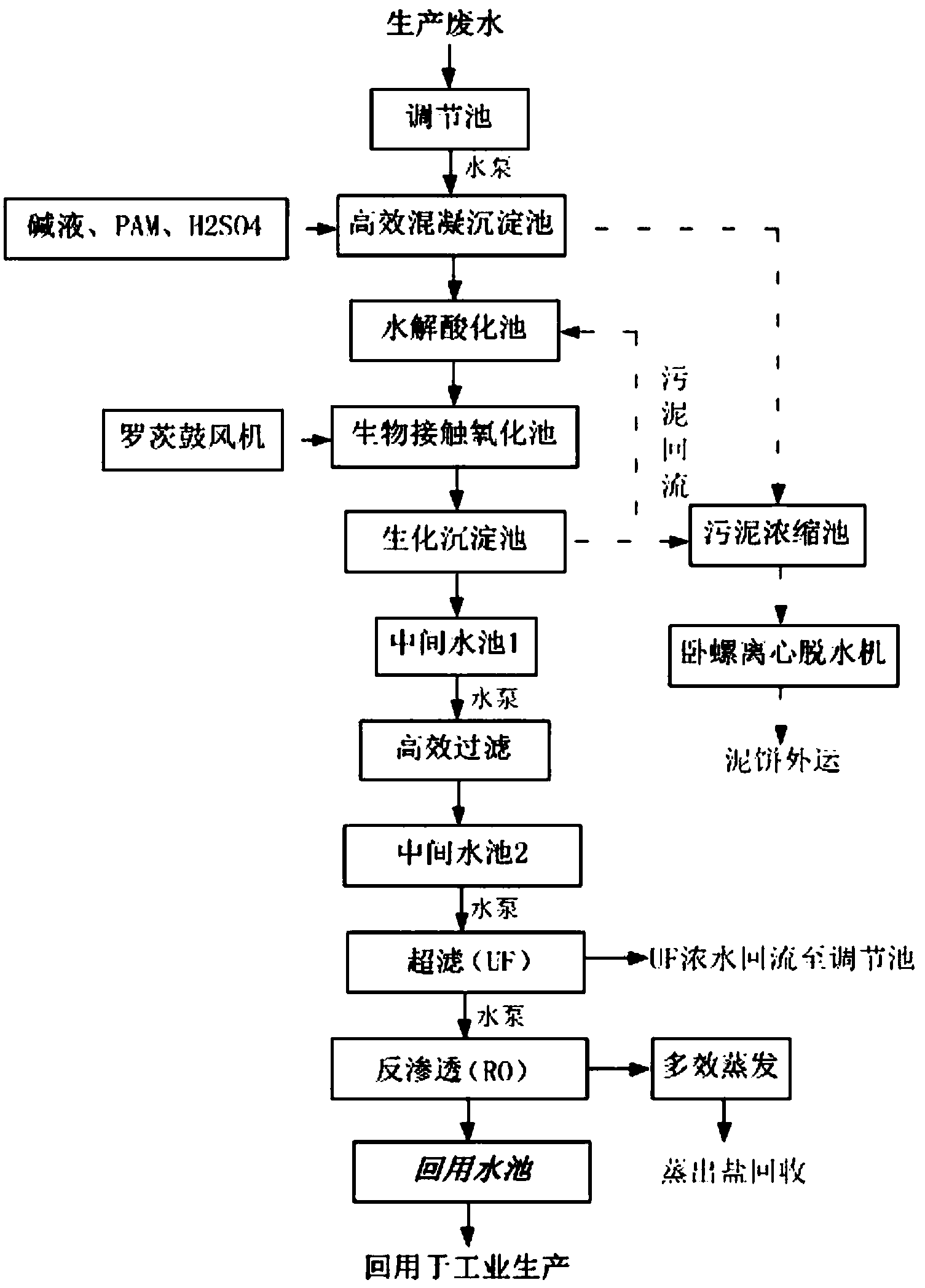 進一步增加對超濾濃水的處理,使整個處理不產生排放。將超濾濃水重新與待處理的生產廢水混合,再次經過本發明的處理方法處理,即依次經過調節、絮凝沉淀、水解酸化、及生物接觸氧化、生物沉淀處理后,再順序經過高效過濾、超濾、及反滲透過濾等,使處理更全面。
