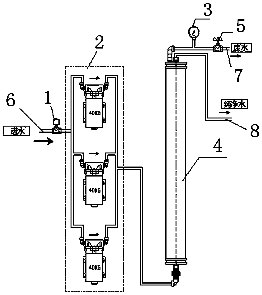 優選的,進水管上設有進水電磁閥,廢水出水管上設有工作壓力表和廢水比例閥;所述的隔膜水泵組由3-5個隔膜泵并聯而成,隔膜水泵組設有進水端和出水端,所述的進水端與進水管相連,所述的出水端與反滲透濾膜相連。
