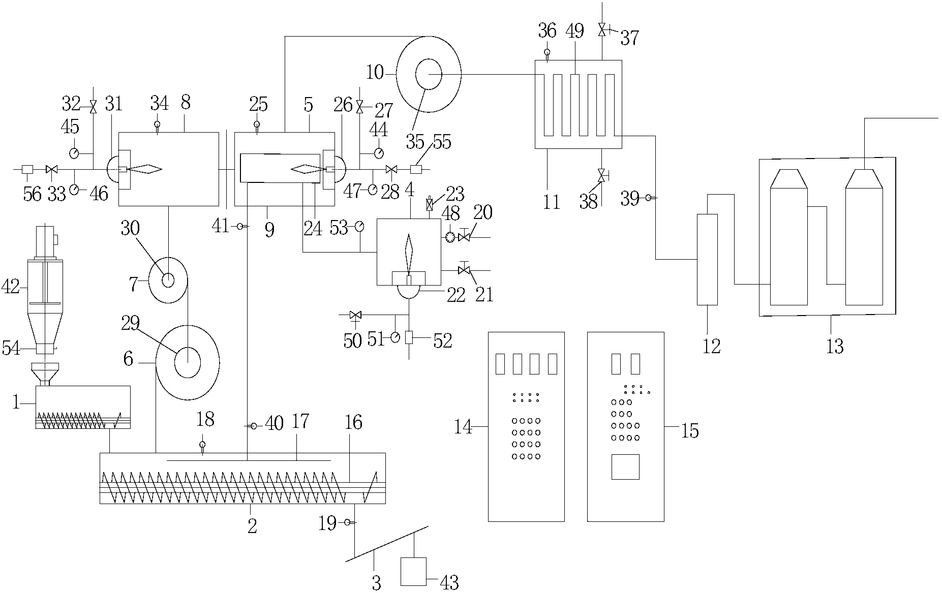S7、將由導熱油加溫裝置處理后的廢氣通過排廢風機送入尾氣終端處理系統進行最終潔凈處理,并由煙囪高空排放。