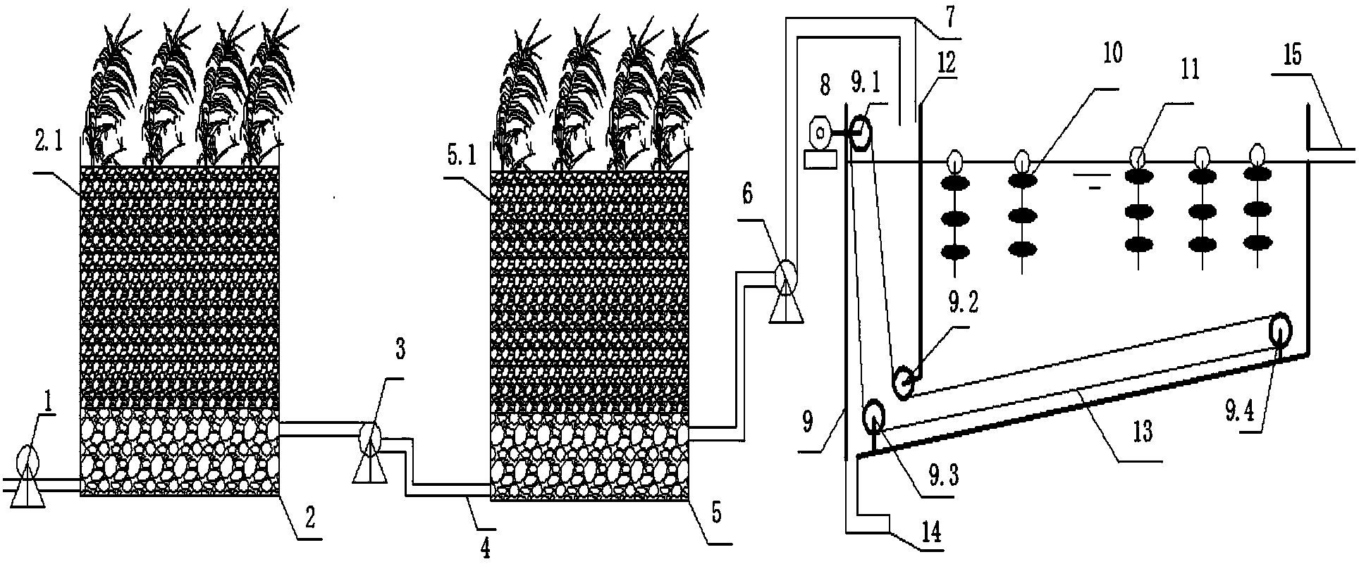1.一種高濁度雨污水集約式生態處理系統,包括潮汐流人工流濕地Ⅰ(2)、潮汐流人工濕地Ⅱ(5)和改進強化生態纖維塘(9),其特征在于:所述潮汐流人工濕地Ⅰ(2)、潮汐流人工濕地Ⅱ(5)和改進強化生態纖維塘(9)通過進水管(4)依次連接,所述潮汐流人工濕地Ⅰ(2)的進水管設置有帶時間繼電器開關的進水管恒流泵Ⅰ(1),所述潮汐流人工濕地Ⅰ(2)和潮汐流人工濕地Ⅱ(5)之間的進水管(4)上設置有帶時間繼電器開關的恒流泵Ⅱ(3),所述潮汐流人工濕地Ⅱ(5)和改進強化生態纖維塘(9)之設置有帶時間繼電器開關的恒流泵Ⅲ(6),所述改進強化生態纖維塘(9)的上方安裝有進水管(7),所述進水管(7)的右側安裝擋板(12),所述擋板(12)底端設置定滑輪(9.2),所述改進強化生態纖維塘(9)的左側安裝帶時間繼電器開關的驅動器I(8),所述驅動器I(8)的右側安裝有定滑輪(9.1),所述改進強化生態纖維塘(9)的底部傾斜,且傾斜方向與進水方向相同,底部的底端和頂端分別設置定滑輪(9.3)、定滑輪(9.4),并設置有刮泥帶(13),所述刮泥帶(13)的左端下方設置有集泥管(14),所述改進強化生態纖維塘(9)的上方設置有彈性填料層(10),所述彈性填料層(10)的上部設置有塑料浮子(11),尾端上方設置出水管(15)。