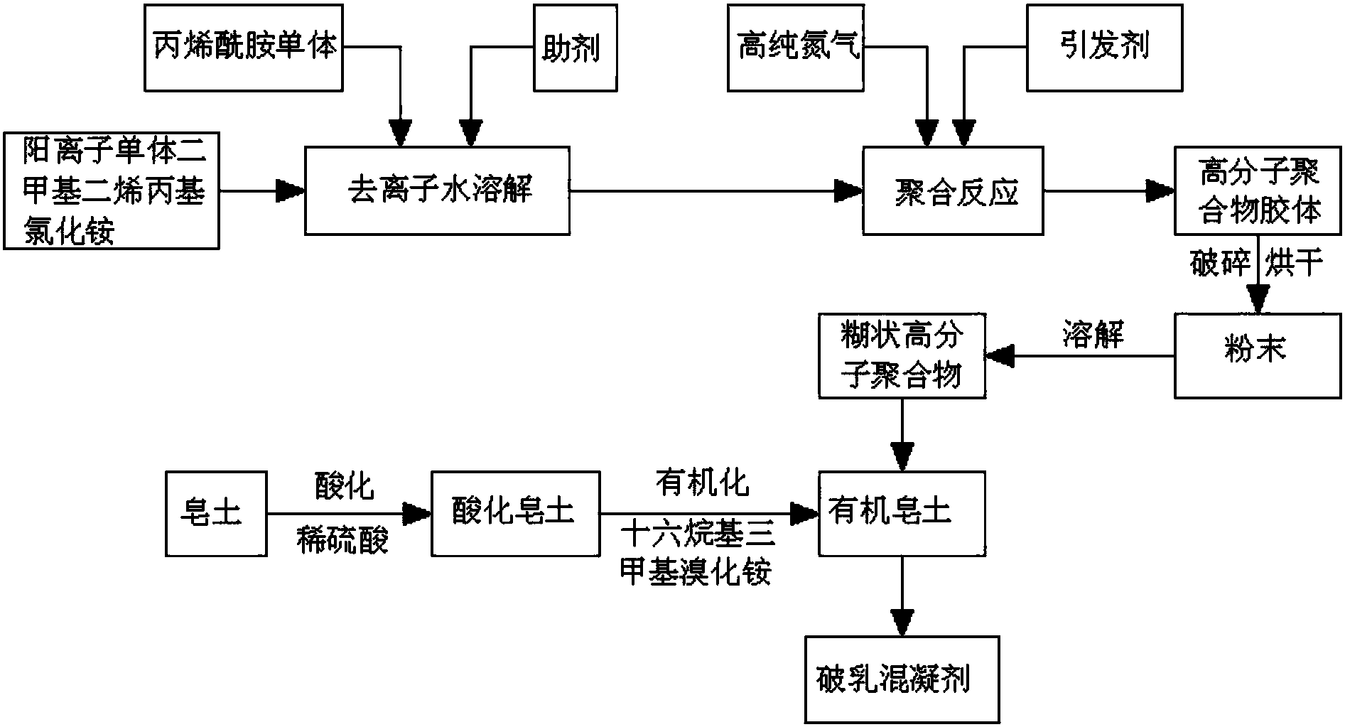 步驟5:往步驟2中得到的聚合物粉末中加入水溶解至糊狀高分子聚合物,再將該糊狀物加入到步驟4中得到的有機皂土中,攪拌至干糊狀,自然晾干或烘干后得到破乳混凝劑。