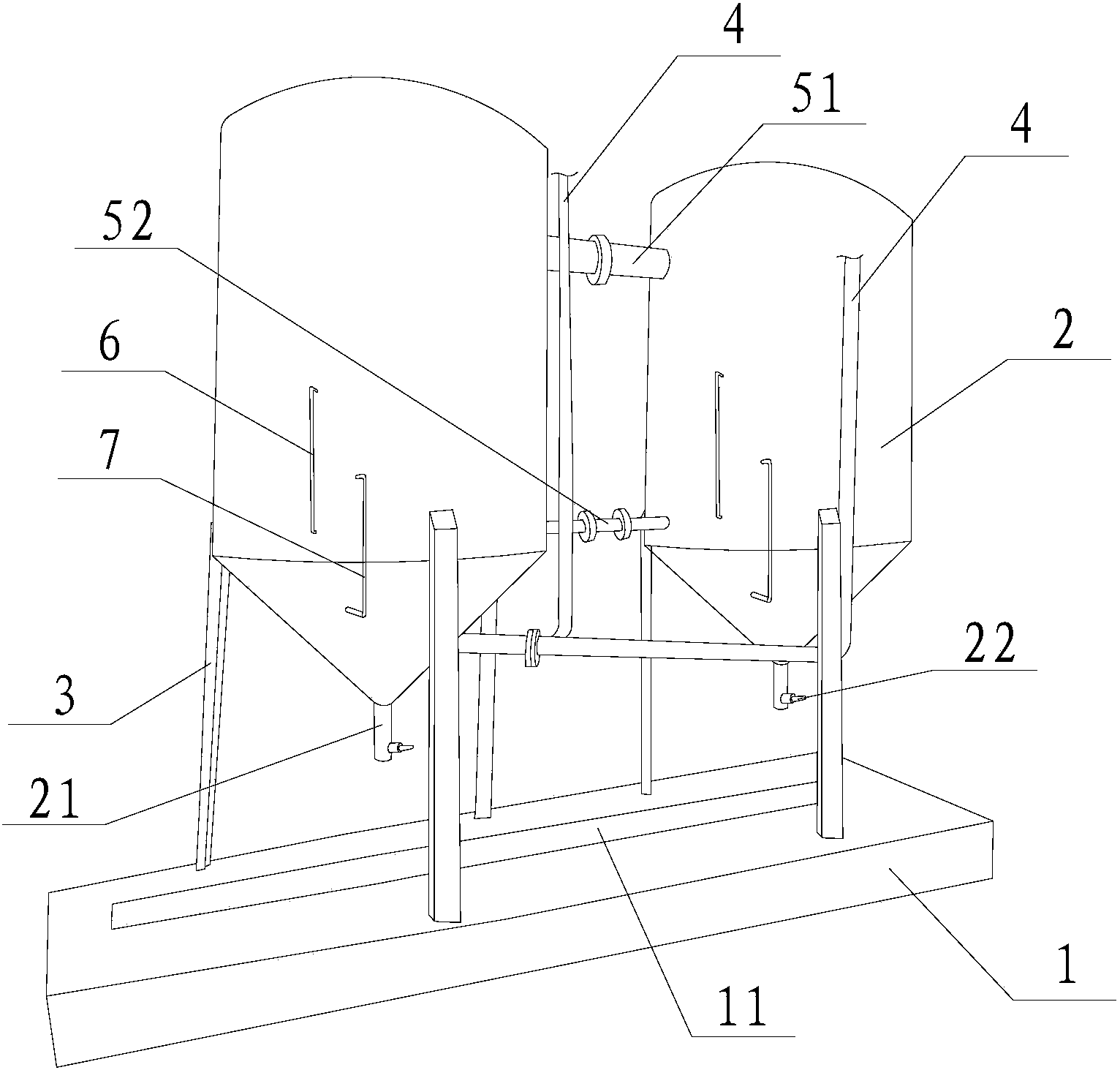 1.一種紡織污泥用靜置出水箱組件,其特征在于:它包括基底(1)、通過多根支架(3)安裝在所述基底(1)上且依次連通的多個(gè)靜置水箱(2)、與任一所述靜置水箱(2)下部相連通的進(jìn)水管(4)、分別安裝在所述靜置水箱(2)側(cè)壁上且與其下部相連通的多根第一液位管(7)以及分別安裝在所述靜置水箱(2)側(cè)壁上且與其相連通的多根第二液位管(6);所述靜置水箱(2)底部設(shè)置有與其相連通的出水口(21),所述出水口(21)處安裝有控制閥(22);所述基底(1)上開設(shè)有與所述出水口(21)相對(duì)應(yīng)的接水槽(11),所述第二液位管(6)高于所述第一液位管(7)。