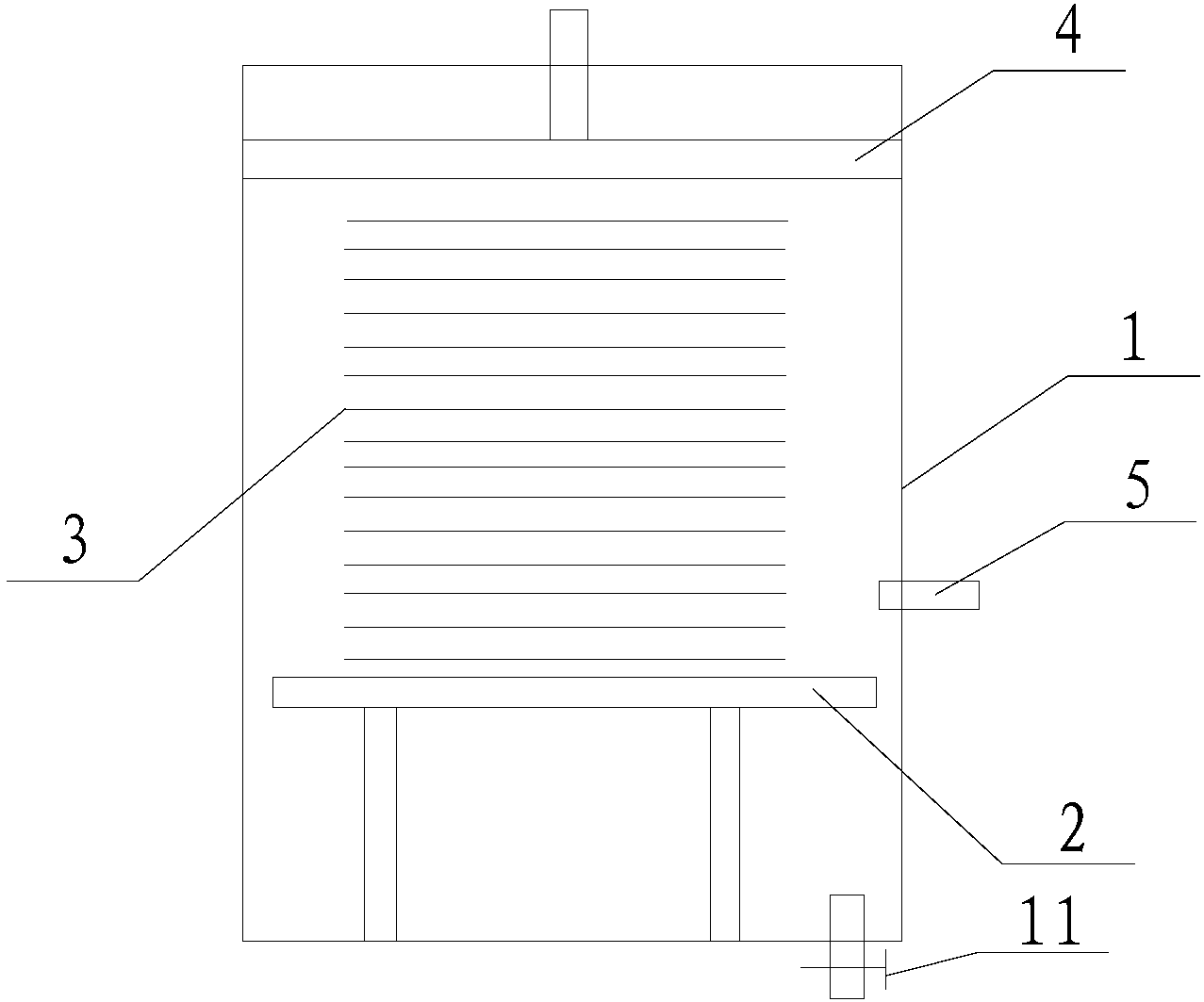 1.一種紡織污泥預干化設備,其特征在于:它包括密封容器(1)、設置于所述密封容器(1)的支撐架(2)、層疊設置于所述支撐架(2)上的多層濾布(3)以及設置于所述濾布(3)上方用于對其進行擠壓的按壓板(4),相鄰兩層所述濾布(3)之間的間距≤2cm,所述密封容器(1)底部安裝有出液閥(11)。