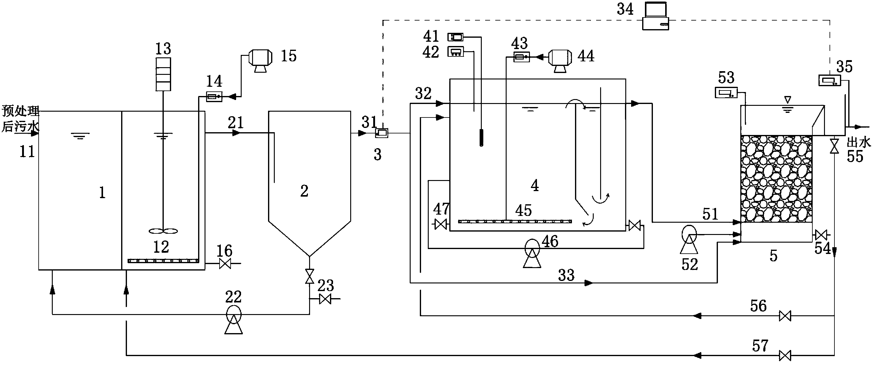 進一步的,所述反硝化除磷反應器由厭氧區和兼氧區組成,進水管和污泥回流管設置在厭氧區,污水回流管、出水管、放空管、曝氣設施和攪拌設施設置在兼氧區。