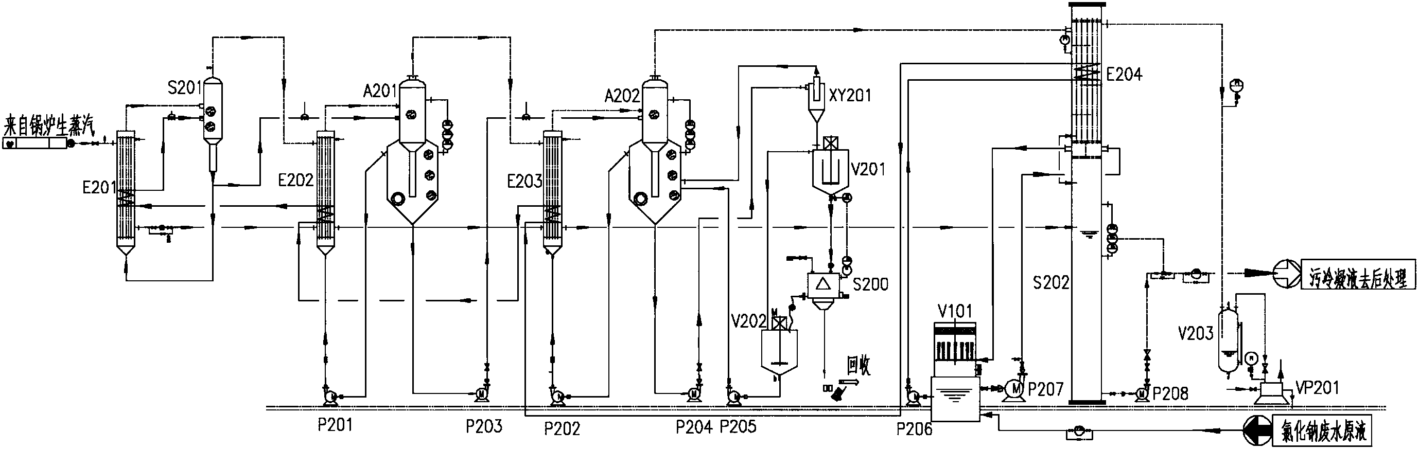 2.根據(jù)權(quán)利要求1所述的一種無需冷卻水的高鹽廢水三效蒸發(fā)結(jié)晶裝置,其特征在于:所述的一效蒸發(fā)器(E201)、二效蒸發(fā)器(E202)和三效蒸發(fā)器(E203)均采用列管式蒸發(fā)器。