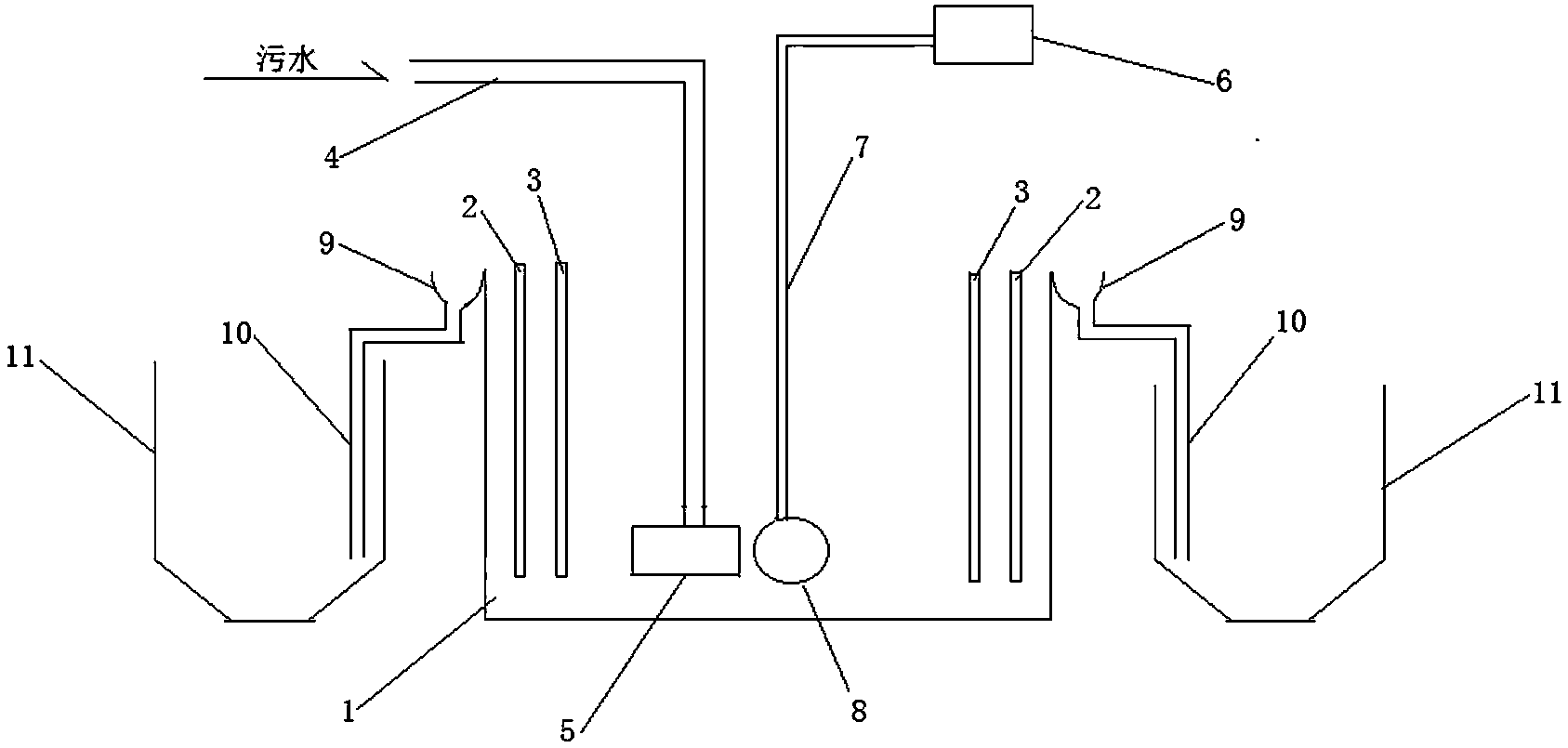 (1)污水預(yù)處理,市政管網(wǎng)將分散的城市污水,匯聚集液后,對(duì)污水進(jìn)行沉砂除渣處理,并用中和調(diào)節(jié)劑調(diào)節(jié)污水的pH為7.5-9,使污水的SS值降低到50mg/L以下,然后注入集液池中,集液池中的污水流入污水進(jìn)水管,污水進(jìn)水管連接電解槽底部的進(jìn)水分布器,使污水從上而下不斷注入到電解槽的底部并通過(guò)進(jìn)水分布器流到電解槽底部的各個(gè)地方;