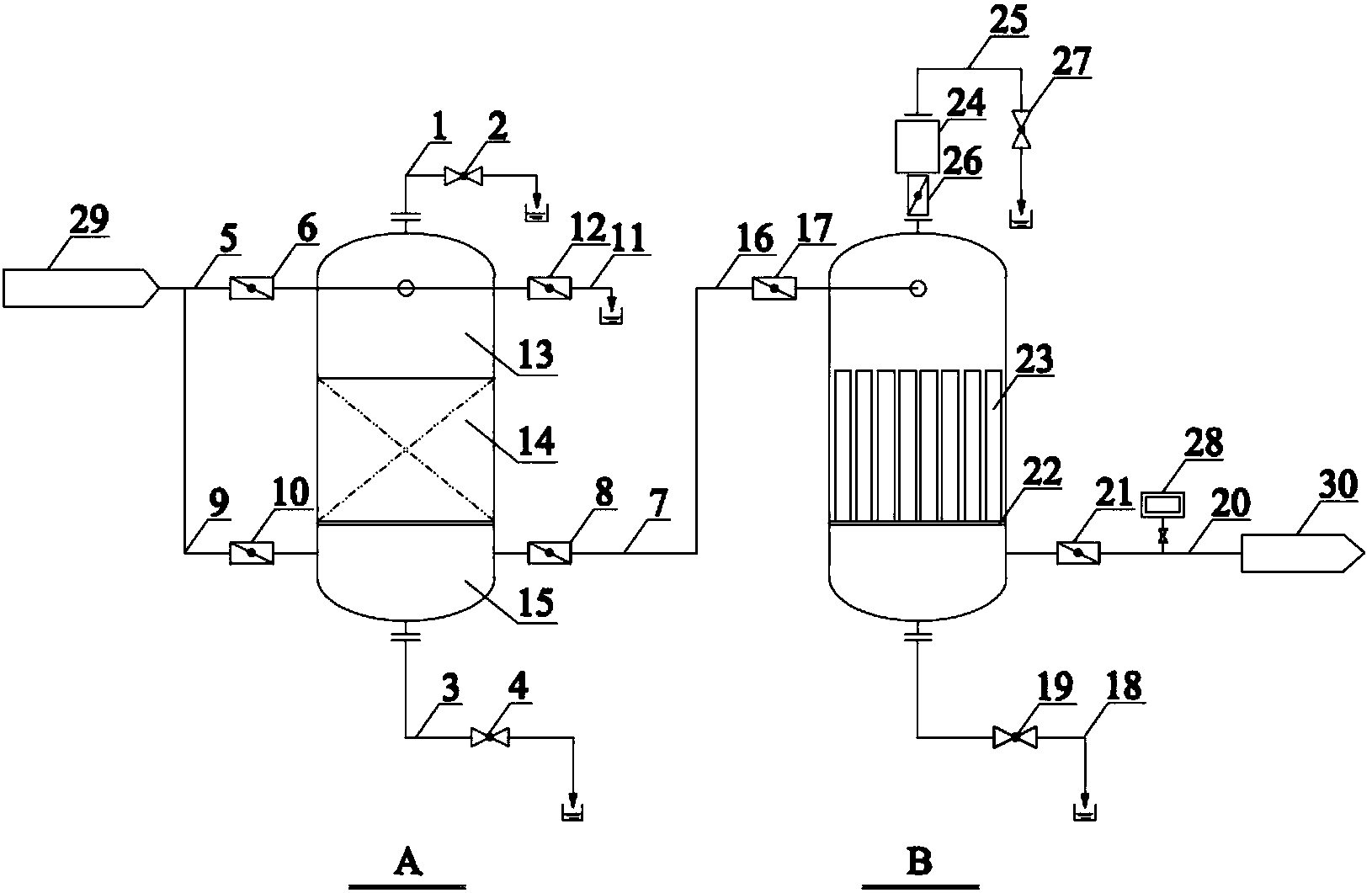 一種針對(duì)閉式循環(huán)熱媒水系統(tǒng)含油污水旁濾除油凈化組合裝置,如圖1所示,它由一個(gè)凝聚精濾罐A和一個(gè)阻截除油罐B串聯(lián)組成,所述的凝聚精濾罐A是一個(gè)圓柱形罐,上、下有圓弧形封頭,上封頭中央連有精濾罐頂排管1和精濾罐頂排閥2,下封頭中央連有精濾罐放凈管3和精濾罐放凈閥4,凝聚精濾罐A罐體上部有精濾罐進(jìn)水管5和精濾罐進(jìn)水閥6,精濾罐進(jìn)水管5與低溫循環(huán)熱媒水進(jìn)水管相連,凝聚精濾罐A罐體下部有精濾罐出水管7和精濾罐出水閥8,凝聚精濾罐A內(nèi)部由上至下分有精濾罐進(jìn)水區(qū)13、填料區(qū)14和精濾罐出水區(qū),填料區(qū)內(nèi)填裝有多孔陶瓷砂濾料或焦炭/多孔陶瓷砂雙層濾料,凝聚精濾罐A的下部有反沖進(jìn)水管9和反沖進(jìn)水閥10,凝聚精濾罐A的上部有反沖排水管11和反沖排水閥12,;所述的精濾罐出水管7通過精濾罐出水閥8與阻截除油罐B的除油罐進(jìn)水管17相連;所述的阻截除油罐B是一個(gè)圓柱形罐,上、下有圓弧形封頭,下封頭中央有除油罐放凈管18和除油罐放凈閥19,阻截除油罐B罐體上部有除油罐進(jìn)水管17,阻截除油罐B罐體下部有除油罐出水管20和除油罐出水閥21,阻截除油罐B內(nèi)有一個(gè)隔板22,隔板22將阻截除油罐分隔成進(jìn)水區(qū)和出水區(qū)兩部分,隔板22上開有多個(gè)圓孔,每個(gè)圓孔與一支HK棒式油水分離膜組件23(南京碧盾環(huán)保裝備有限責(zé)任公司提供)相匹配,HK棒式油水分離膜組件23安裝固定在隔板22上,阻截除油罐B的上封頭中央有集油器24,集油器24頂部有排油管25。