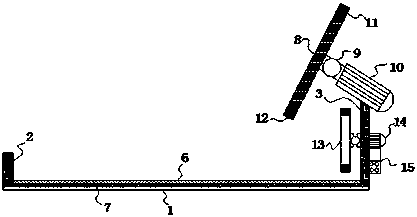 所述第二側(cè)板(3)的上端固定安裝有第一步進(jìn)電機(jī)(10),且第一步進(jìn)電機(jī)(10)通過(guò)傳動(dòng)機(jī)構(gòu)(9)傳動(dòng)連接太陽(yáng)能蓄電池板(8),所述太陽(yáng)能蓄電池板(8)和平面反光板(13)的上下兩端均固定安裝有光敏傳感器(11)和角度傳感器(12),所述太陽(yáng)能蓄電池板(8)電性連接控制器(15),所述光敏傳感器(11)和角度傳感器(12)分別電性連接控制器(15),所述控制器(15)分別電性連接第一步進(jìn)電機(jī)(10)和第二步進(jìn)電機(jī)(14)。