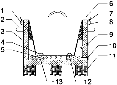 1.一種化工污泥安全便裝存放箱,包括外箱體(3)和箱蓋(6),其特征在于:所述外箱體(3)底部設有條形承重塊(11),所述外箱體(3)一側中部和下部分別設有注水口(9)和出液口(10),所述外箱體(3)上相對的兩側設有半掛環(2)和插口(8),所述外箱體(3)內部設有液體存放區(13),所述外箱體(3)內底部中間位置設有連接座(5),所述連接座(5)上部連接有內箱體(1),所述內箱體(1)底部設有圓孔(12),所述圓孔(12)連接有半球濾網(4),所述內箱體(1)固定連接于外箱體(3),所述箱蓋(6)下部設有與插口(8)相匹配的插塊(7)。