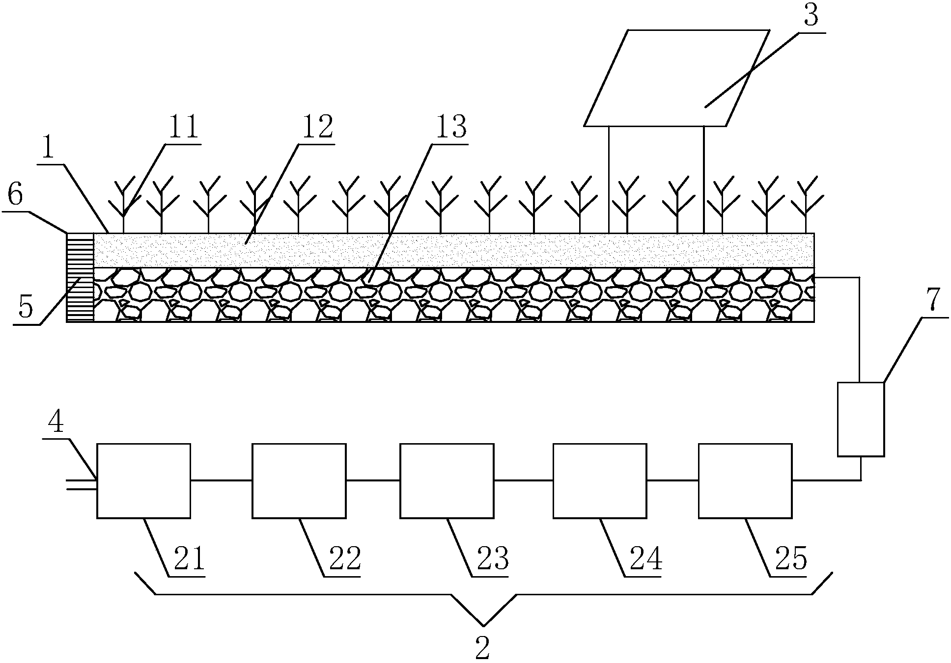 與現有技術相比,本發明的優點在于:本發明太陽能微動力人工濕地農村污水處理系統采用立體布局:將污水處理裝置采用地埋式設置在人工濕地下方,地表為人工濕地,做園林式設計,太陽能光伏控制系統呈點狀豎立分布在人工濕地,相比其他工藝節約占地面積;在人工濕地中種植除磷植物,污水處理裝置與人工濕地之間通過提升裝置連通,本發明在使用污水處理裝置良好去除COD、氨氮、SS等污染因子的同時,通過人工濕地的除磷作用保證總磷的消減,除磷率達到60%以上,采用太陽能光伏控制系統為污水處理裝置提供能源,采用特有的工藝,減少了設備運行的能耗,極大的減少工藝運行費用