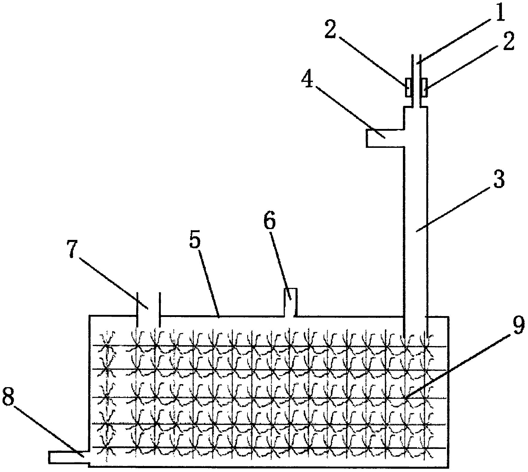 1、本發明將河湖污水通過采集泵或攔河壩收集進入處理裝置,污水經過磁水器被分解為小分子水使之提高溶解度,然后流入水氣混合管,在重力的作用下將進氣管進入的氣體帶入箱體,利用空氣與水體充分接觸來達到爆氣增氧的目的,同時水體和空氣又與生物填料表面生長的生物膜接處,達到水體增氧和生物降解污染物的兩種效果,從而改善水體指標,提高環境質量。